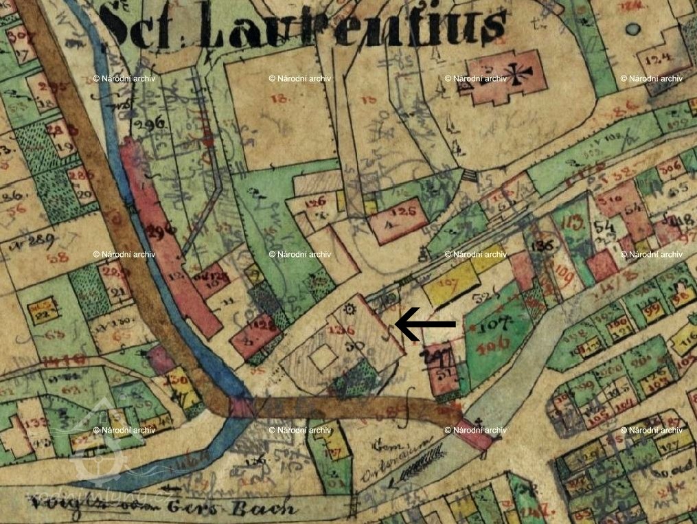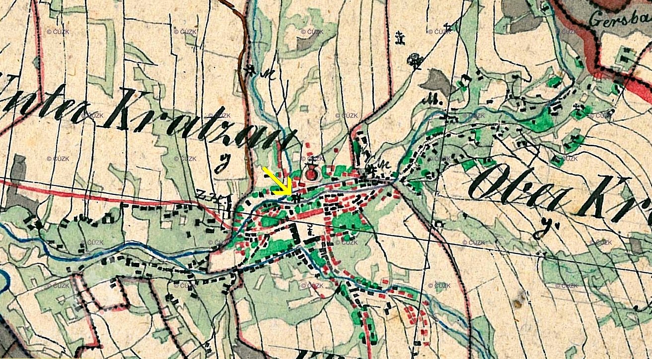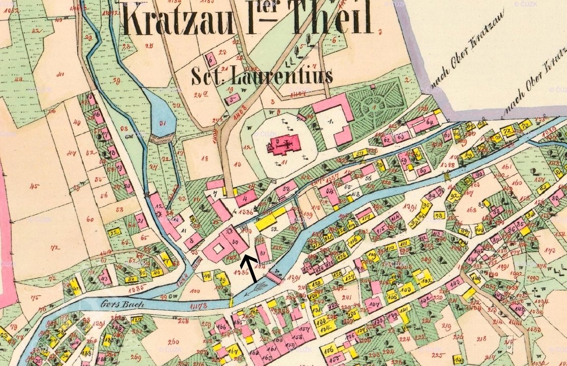 V podzemí byl odtok řešen pouze pod budovou mlýna a v její těsné blízkosti, jak dokládá cís. otisk stabilního katastru. V roce 1867 kupuje budovu mlýna továrník Priller a po přestavbě zavádí v budově textilní výrobu. Z tohoto roku nejspíše pochází i stavba zaklenutí náhonu a prodloužení odtokové části. Při vzedmuté hladině ve Vítkovském potoce a na Jeřici se tím řešila stabilní hladina vody pod vodním kolem v budově a je možné, že díky tomu byl zvětšen i průměr nového vodního kola. Další variantou vývoje je prodloužení náhonu k další továrně, respektive k odběrnému splavu přímo v Jeřici. Bohužel stavbu splavu není možné pro nedochované archivní materiály datovat. Od továrníka Prillera kupuje továrnu Anton Jäger (od roku 1912 součást společnosti Chrastavská přádelna ovčí a vigoňové vlny). V roce 1927 prošlo vodní dílo rozsáhlou přestavbou. Po odstranění vodního kola byla vytvořena na úrovni suterénu nová betonová podlaha, kašna, vývařiště a instalována Francisova horizontální turbina. Turbina byla do firmy A. Jäger pouze pronajatá firmou "Günther und Löhse Hermannseifen", jak dokazuje tabulka na čele turbiny. Turbina byla primárně určená k přímému pohonu strojů přes transmise a dynamo bylo umístěno mimo osu turbinového hřídele. Pod plány na přestavbu je podepsána chrastavská firma Hoffmann a Möhse. Firma A. Jäger skončila v továrně v roce 1945 a z budov se stalo skladiště konfiskovaného majetku. Od roku 1949 spadala továrna pod podnik státní Nový byt. V roce 1950 proběhla na vodním díle revize, kdy bylo konstatováno, že vodní dílo (především přítoková část) je ve špatném technickém stavu. 18. října 1950 bylo rozhodnuto o zrušení vodního díla a následně byla přítoková část využita pro stavbu kanalizace. Bývalá lednice Kamenného mlýna se v současnosti nachází pod úrovní suterénu tovární budovy čp. 136 - dnes po demolici. Lednice v druhé polovině 20. let 20. století prošla přestavbou, kdy byla doplněna o mohutnou betonovou vestavbu pro Francisovu horizontální turbinu s mokrou savkou. Na čele turbiny je umístěna tabulka "Eigentum der Firma Günther und Löhse Hermannseifen". Jedná se o klasickou přestavbu lednice. Na místě je zachována kompletní turbina včetně mokré savky. Na turbině je poškozen pouze vnější mázničkový aparát a chybí doplňující transmise a dynamo, které bylo na konci 90. let 20. století odvezeno do šrotu. Samotná turbina včetně kolena savky, respektive celá kašna, je zasypána stavebním odpadem. Lednice má z doby stavby turbiny upravenou počvu (stavba vývařiště) a strop. Při geologické sondě se podařilo na konci roku 2008 objevit původní schody vedoucí z jižní strany do lednice. Stěny lednice jsou provedené převážně ze žulových pouze hrubě opracovaných bloků a kvalitně zpracovaných pískovcových kvádrů, občas doplněnými o fylitové až svorové kvádry. Rozměry lednice: Výška hlavní prostory: 3,7 m Šířka hlavní prostory: 4 m Celková délka k hraně odtokové části náhonu: 8,3 m Odtoková část náhonu Odtoková část náhonu je rozdělena na pět úseků. 1. úsek: Prvních 11,5 metrů je náhon veden ve stejné ose jako lednice, stropní část je již klenutá, přičemž je použit stejný materiál jako na stěny lednice (žula, pískovec, fylity až svory). V levé části je řada žulových bloků vysazena do volného prostoru. Na kraji římsy je zazděný původní inspekční vchod do náhonu. Délka: 11,5 m Výška: 3,4 m Šířka: 2,2 m 2. úsek: Další část je tvořena nižším profilem chodby a je zděna převážně z pískovcových kvádrů. Předpokládá se, že se jedná o relikt odlehčovacího oblouku, nebo dokonce mostu přes náhon z doby, kdy byl ještě v podstatné délce otevřený na den. Délka: 3 m Výška: 2,4 m Šířka: 2,2 m 3. úsek: Třetí úsek pokračuje ve stejném směru jako druhý úsek, v jeho konstrukci jsou použity žulové i pískovcové kvádry a u paty klenby fylitové a břidlicové bloky. Ústřední klenáky jsou v tomto úseku tvořeny pouze kvalitně opracovanými pískovcovými kvádry. Na 17 metru byla dodatečně zbudována šachta o profilu téměř 1 x 1 m vedoucí na povrch (v současnosti překryto betonovými panely. Zčásti je třetí úsek již ražen ve skalním masivu. Délka: 22,5 m Výška: 3,4 m Šířka: 2 m 4. úsek: Typově starší část náhonu (může se jednat i o reakci na výšku terénu nad náhonem) nižší klenbou a širším profilem. Navázání na třetí úsek není zcela čisté, ale použitý materiál stěn a klenby je totožný s jediným rozdílem - větším poměrným zastoupením pískovcových kvádrů v klenbě. Počva náhonu je ve čtvrtém úseku zanesena místy až 80 cm mocnou vrstvou sedimentů. Délka: 35 m Výška: 2,4 m Šířka: 2,3 m 5. úsek Koncová část náhonu ústí přímo nad jezem do Jeřice. Je pravděpodobné, že jez je pokračování náhonu vedoucí dále buď pod ulici Alšovu, nebo pod ulici Mostní. Náhon je i v tomto úseku budován z žulových a pískovcových kvádrů. Fylity a další místní horniny jsou použity jen omezeně do spár. Délka: 40 m Výška: 2,4 m Šířka: 2,3 m Jez - pokračování náhonu v Jeřici. Jez je tvořen velkými žulovými překlady o šířce cca 2,5 m, na okraji je dozděn menšími žulovými bloky. Část ústí náhonu tvoří přepad do Jeřice a přibližně polovina (není známá hloubka od hladiny na počvu u ústí náhonu do řeky) celkové výšky profilu je svedena pod jez. Náhon pokračuje dále ulicí Mostní.