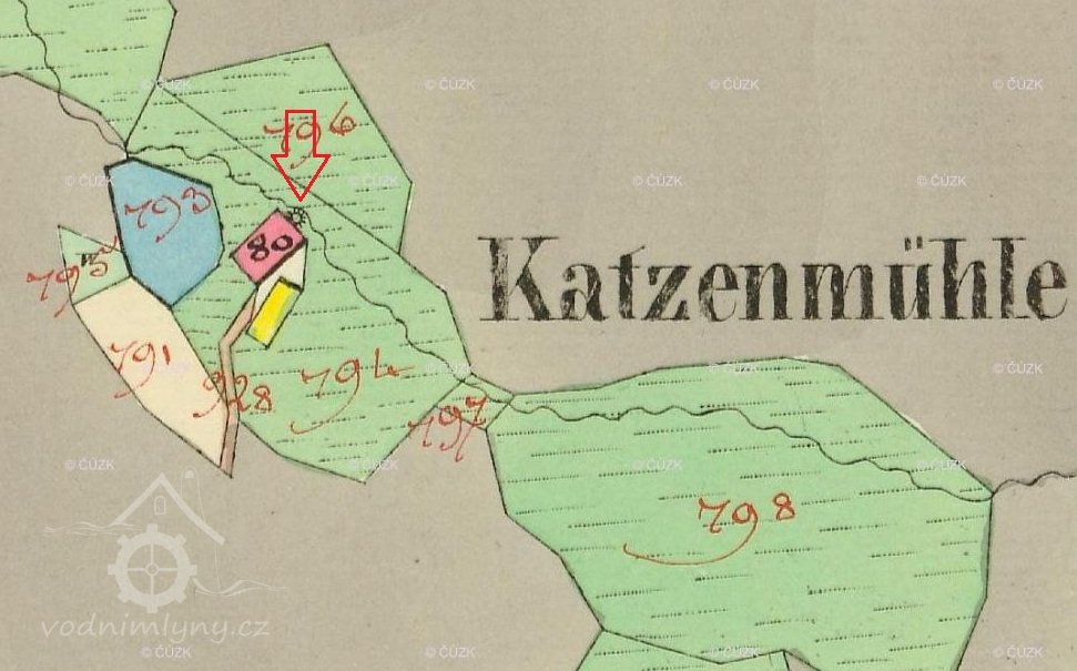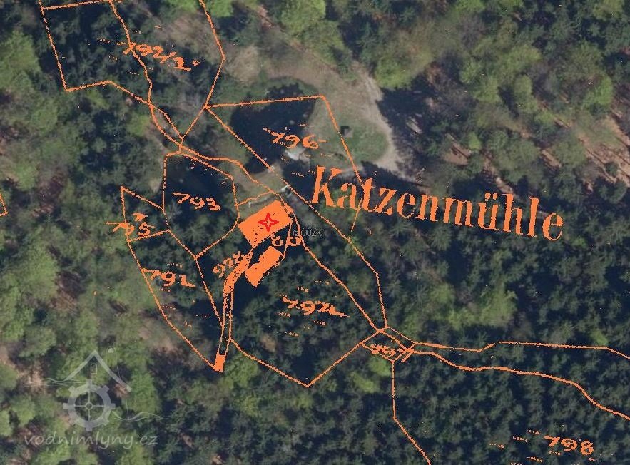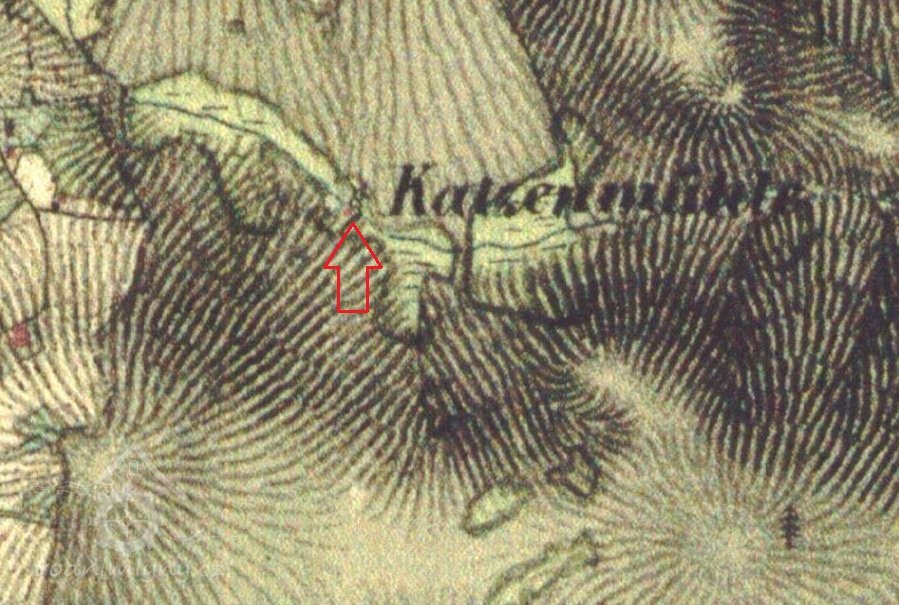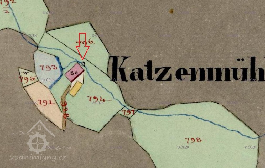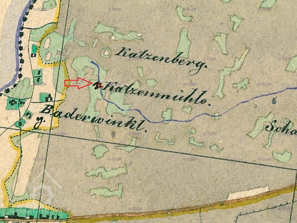 Mlýn stál uprostřed lesů na pravém břehu malého potůčku zvaného Prudký potok, dříve Katzenbach, pod Kočičím vrchem. Později sloužil jako vrchnostenská hájovna.