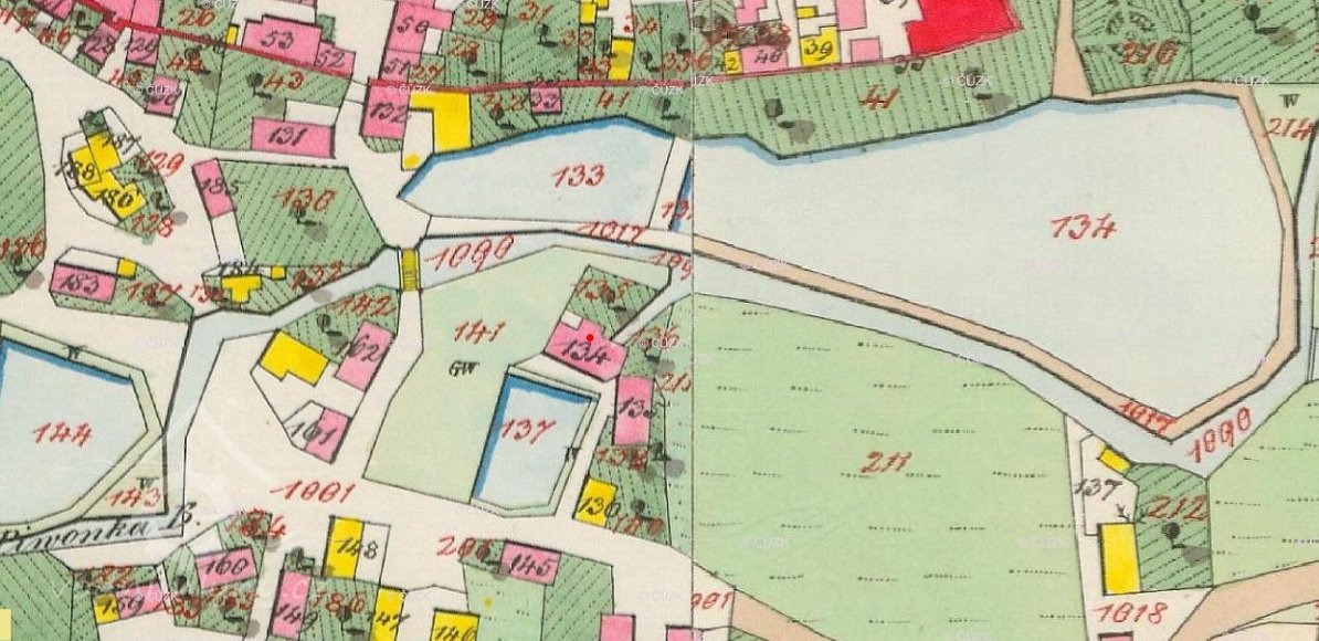 Indikační skica z roku 1838 - náhon z Pivoňky, větší nespalná budova, náhon vedl budovou, jedno kolo, za mlýnem se náhon opět spojuje s Pivoňkou. Originální mapa a otisk nejsou v místě publikovány. J. G. Sommer zmiňuje v Poběžovicích k roku 1839 mj. panský pivovar na 20 sudů, lihovar, papírnu, kovárnu, 3 mlýny a 2 mlýny na kroupy.