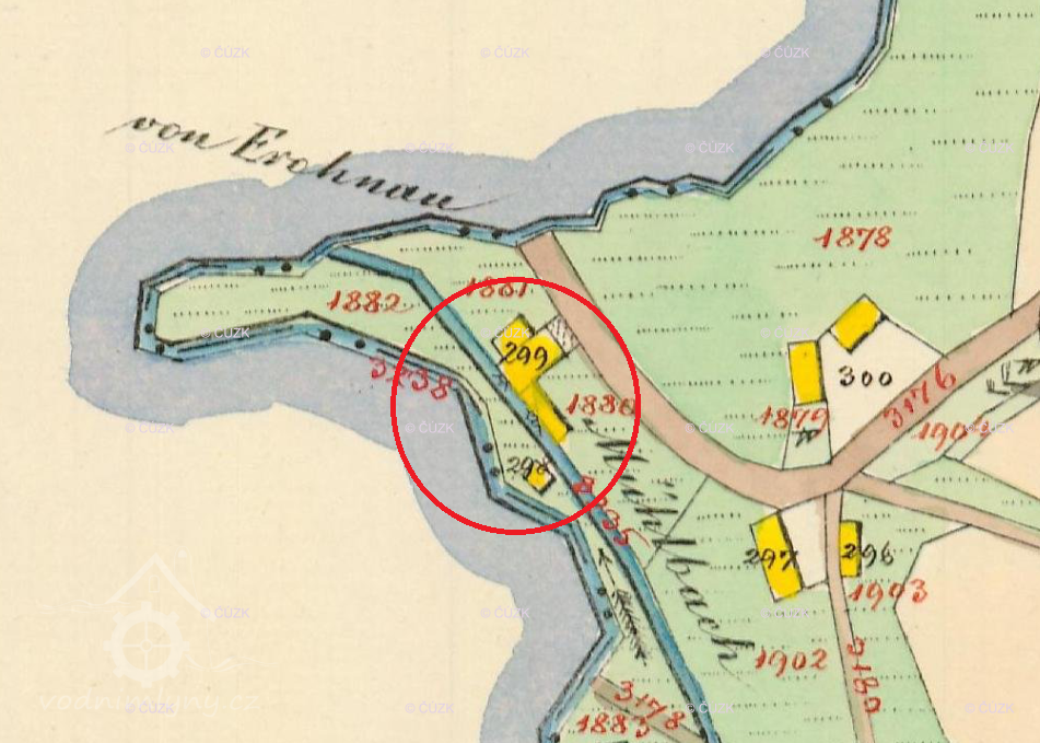 Popis1930: 1 kolo na svrchní, hltnost 0,14 m3/s, spád 3,8 m, výkon 4,5 HP