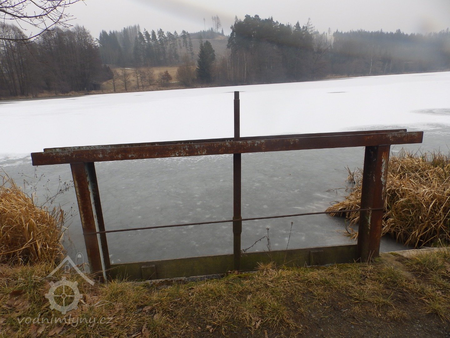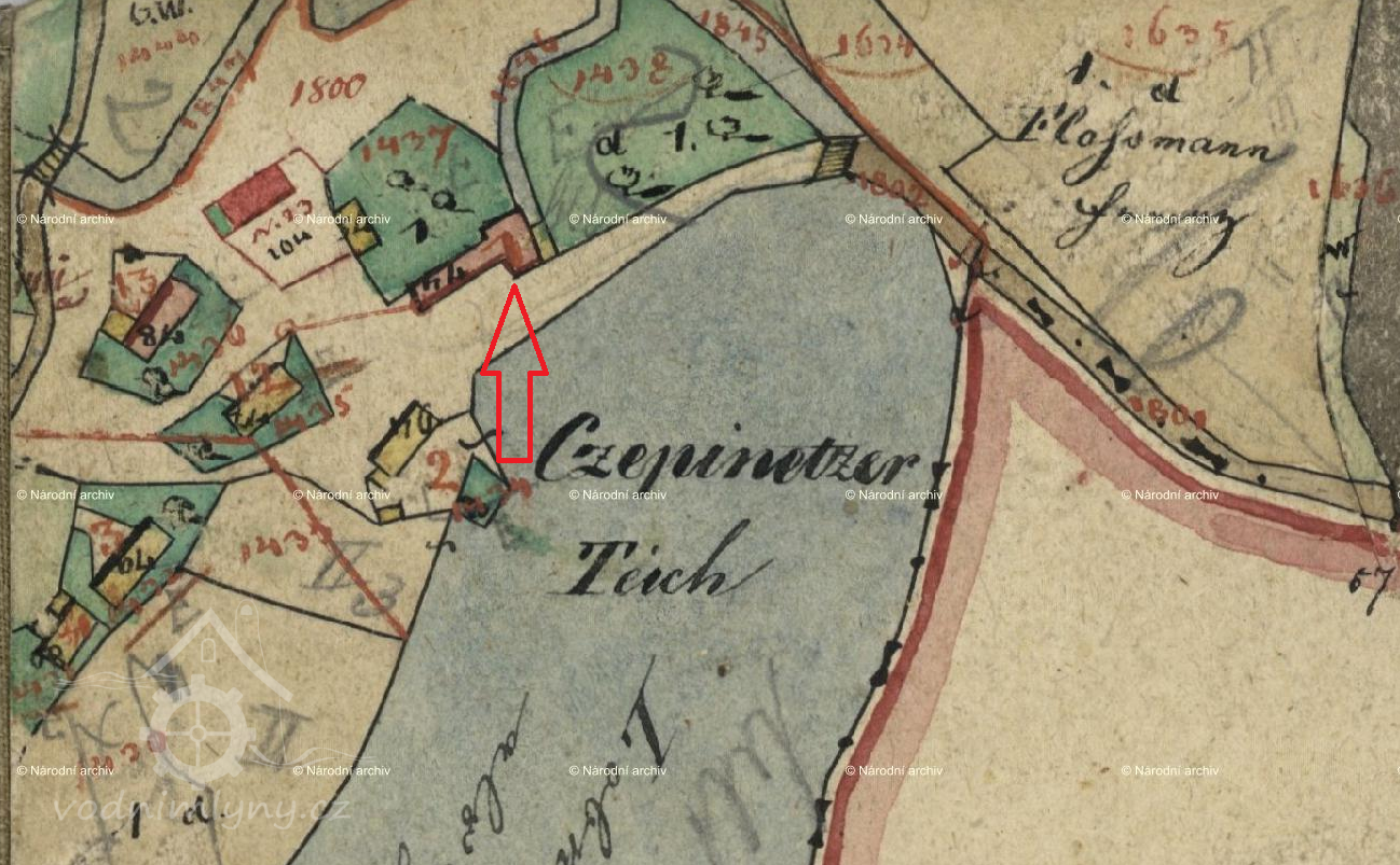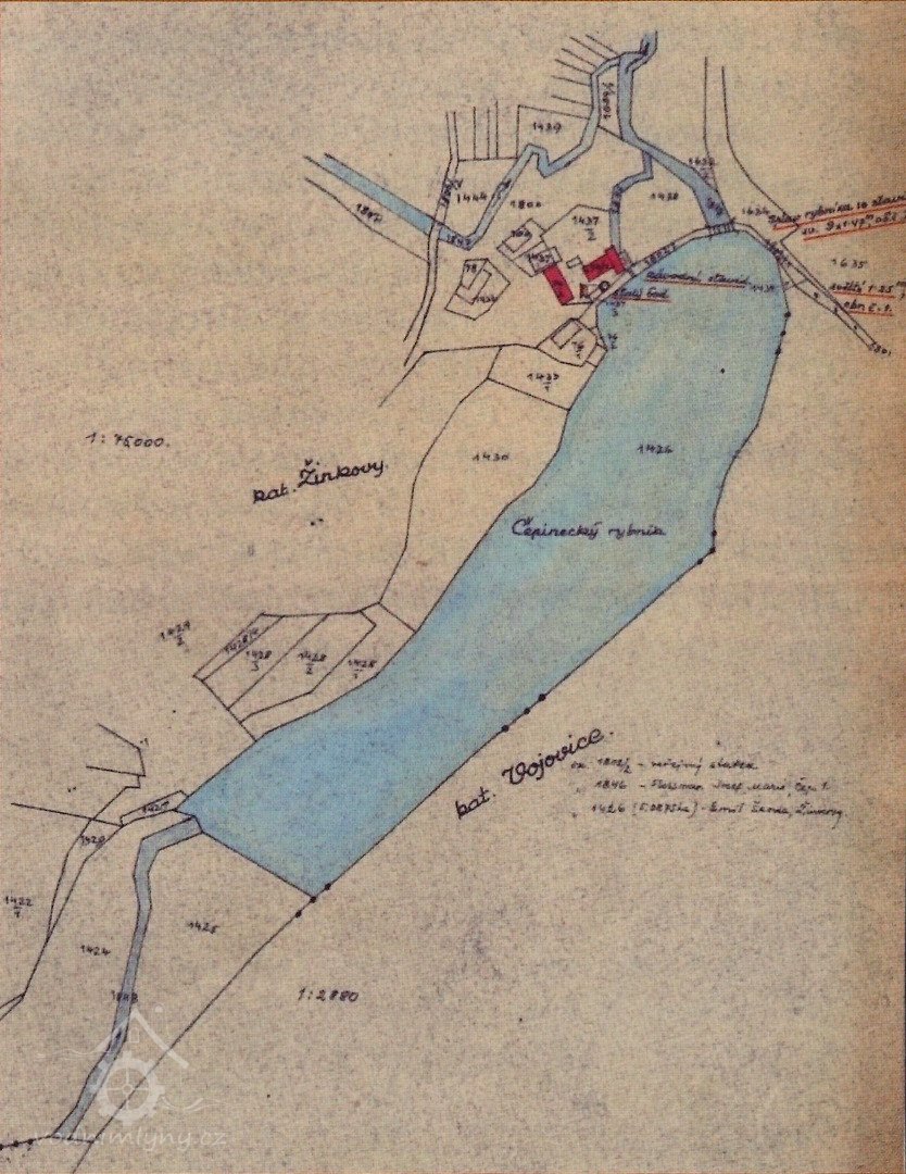 1901: rybník nad mlýnem opatřen 9 tabulovými stavidly o šířce 1,47 m, a výšce nad prahem 1,35 m, voda vtéká na mlýn betonovým klenutým propustkem 4,2 m dlouhým v hrázi rybníka o světlosti 1,70 m a výšce klenby 1 m, kterýžto otvor uzavírá dřevěné ruční napouštěcí stavidlo o šířce 1,46 m a výšce 1,03 m. Před stavidlem se nalézá dřevěné brlení. Propustkem voda natéká do betonových vantroků o délce 4,30 m a šířce 1,7 m a hloubce 0,6 m, ukončená dřevěným stavidlem 1,25 m širokým a 0,53 m vysokým. Pomocí kluzu dopadá voda na kola.