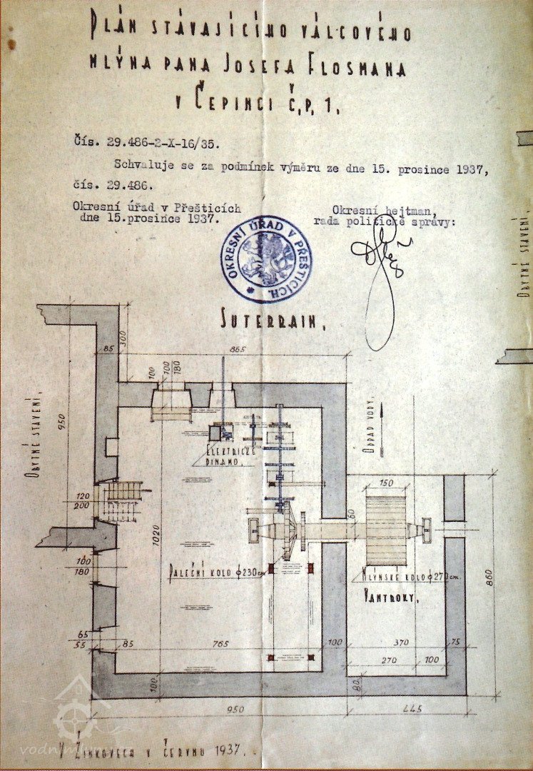 1930: 1 kolo na svrchní vodu, hltnost 0,153 m3/s, spád 3,2 m, výkon 4,2 HP
