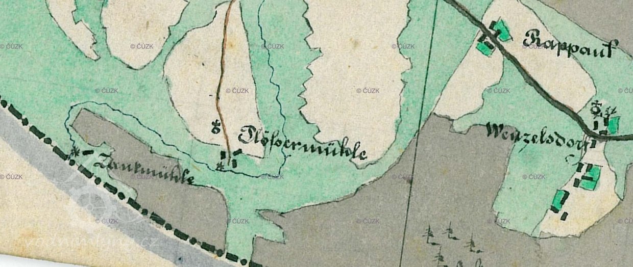 1838 – Na otisku stabilního katastru i skice na potoce před mlýnem rybníček, u mlýna další nádržka, nespalná obdélníková budova s jedním kolem, k ní kolmo dřevěná budova pily s jedním kolem. U mlýna další nespalná budova s dřevěnými přístavky. Majitelem Spörl. Pod mlýnem další malý rybníček a za ním ve směru k Zankmühle malá nespalná budova s jedním kolem, která nepatří ke mlýnu. Na originální mapě zaznamenány rozsáhlé přestavby budov.