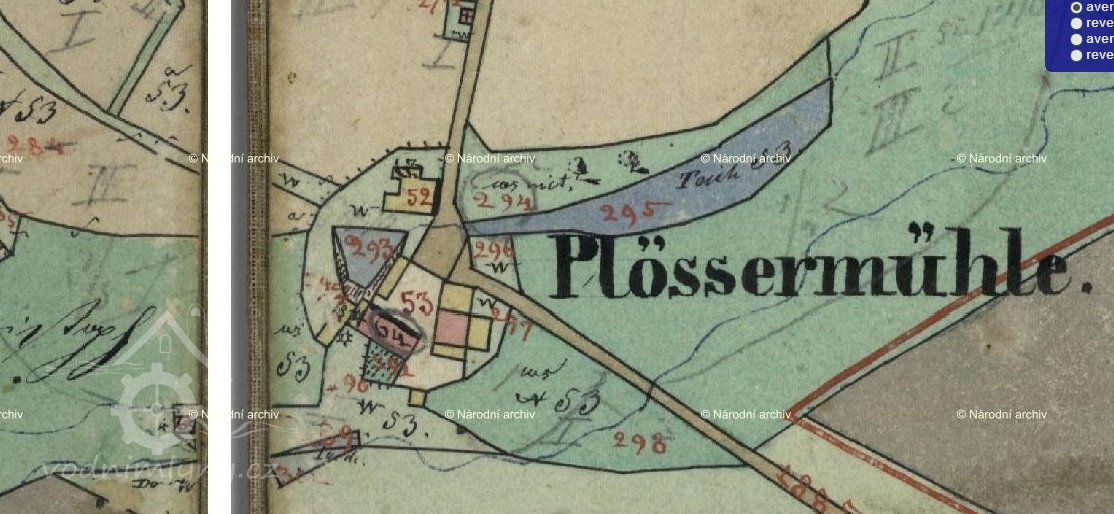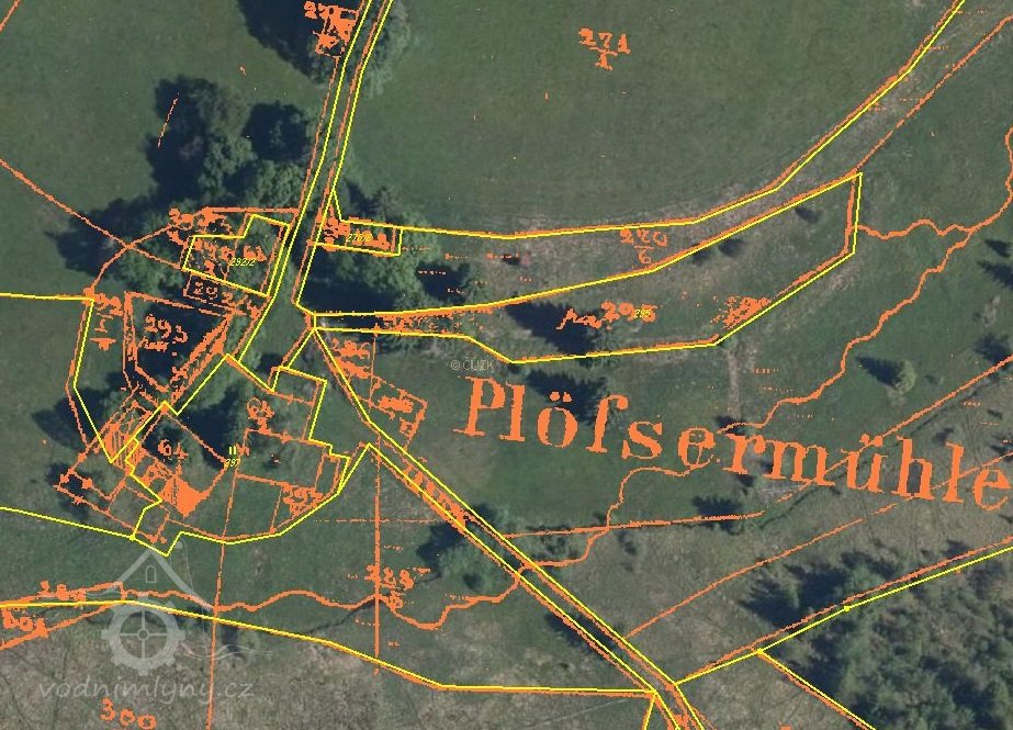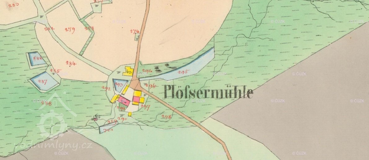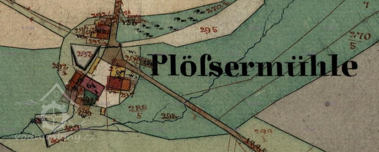 Veský, Plešský mlýn; Dorfmühle, Plössermühle