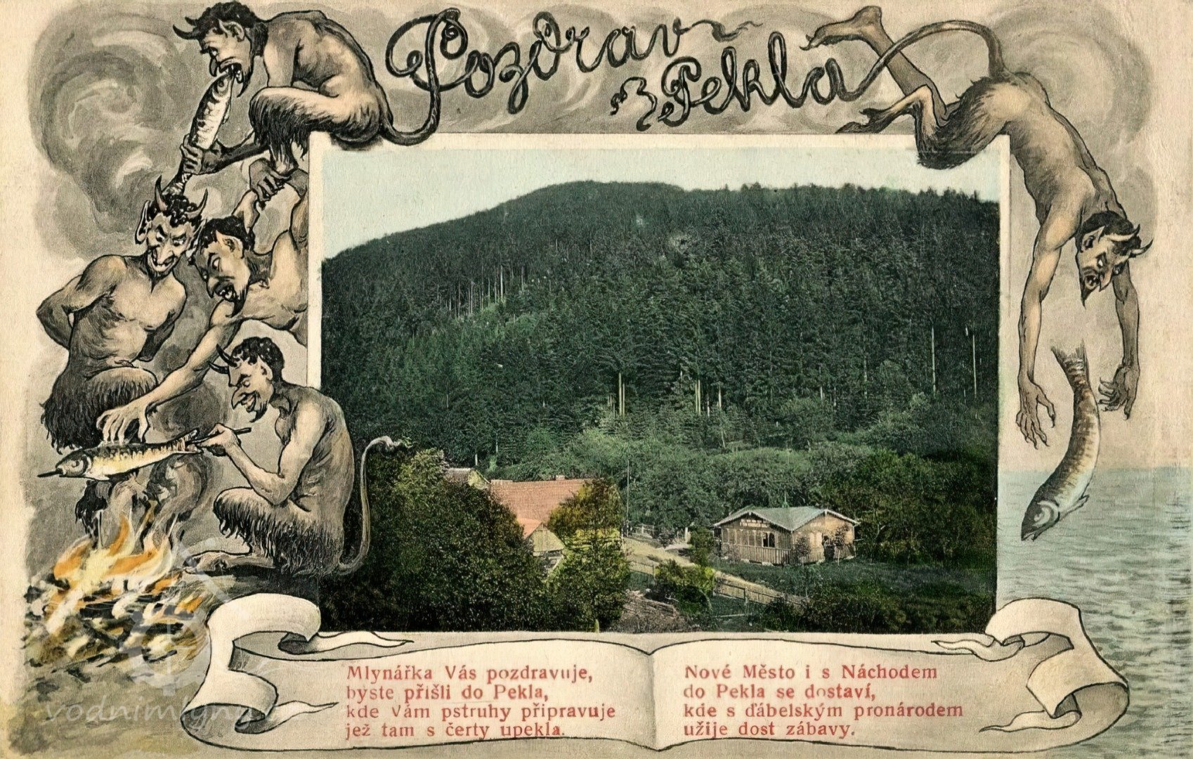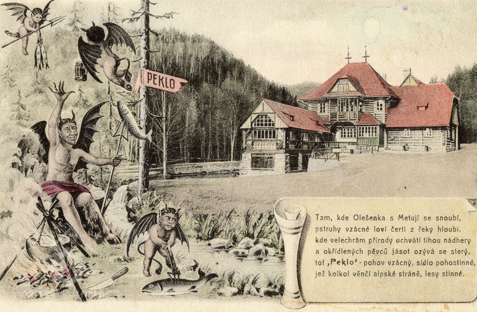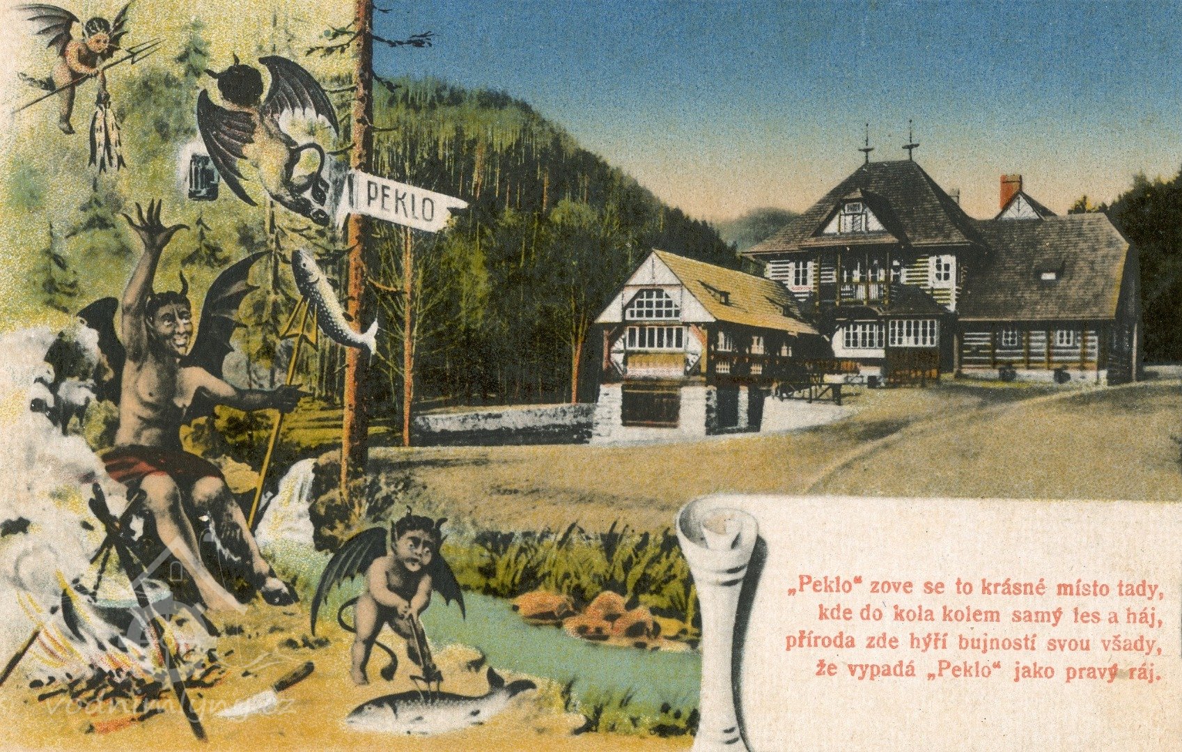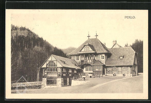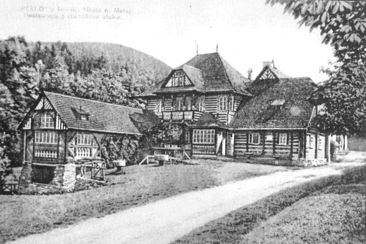 Bývalý mlýn s pilou umístěný v údolí řeky Metuje v osadě Peklo nedaleko Nového Města nad Metují zakoupil továrník Josef Bartoň roce 1908. Nechal jej přestavět architektem Dušanem Jurkovičem, který se v té době podílel na úpravách novoměstského zámku, ve stylu romantizující lidové architektury inspirované valašským a slovenským folklorem. Přízemní část objektu, v níž je umístěna hospoda, je roubená, v konstrukci jsou osazena malá dvoukřídlová okénka dělená do šesti tabulek. Nad vstupní částí se nachází patrová část objektu s valbovou střechou a balkonem, který kryje vstupní zádveří a nad nímž je ve střeše umístěn vikýř se štítem s diagonálně kladenými prkny. Před touto částí je kolmo posazená přízemní hmota se sedlovou střechou a okny členěnými do jednoduchých křídel. Štítová stěna je členěna velmi kreativně barevnými řezbářskými střechou a rázně kladenými prkny a trámy.