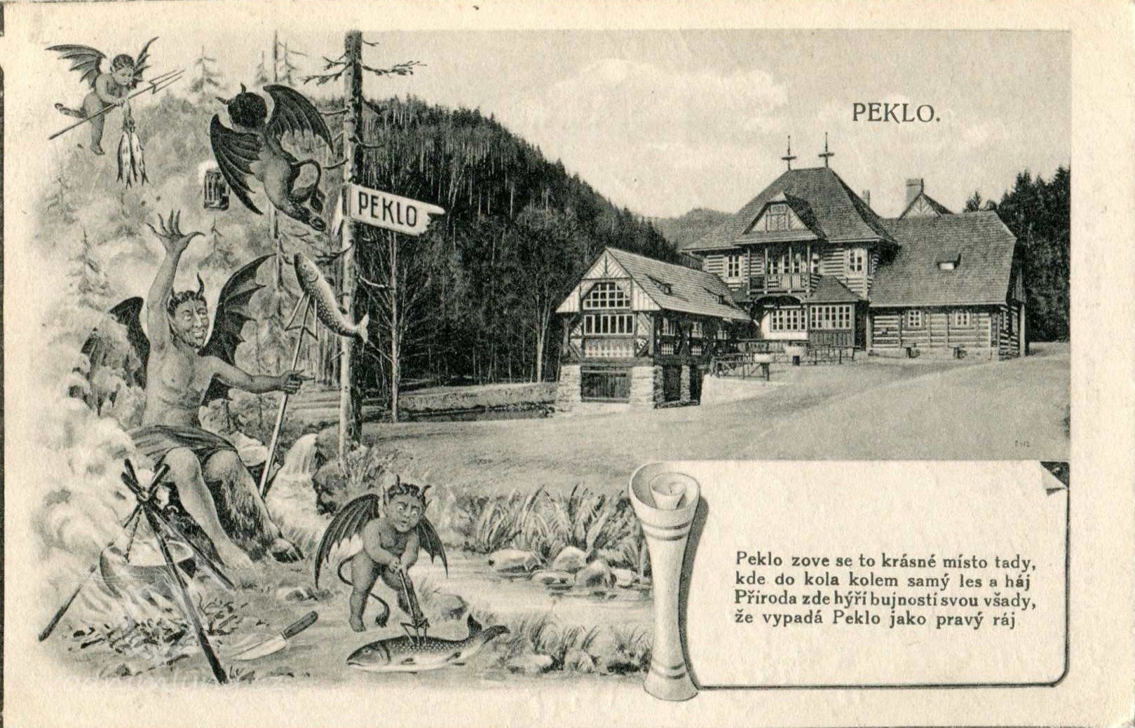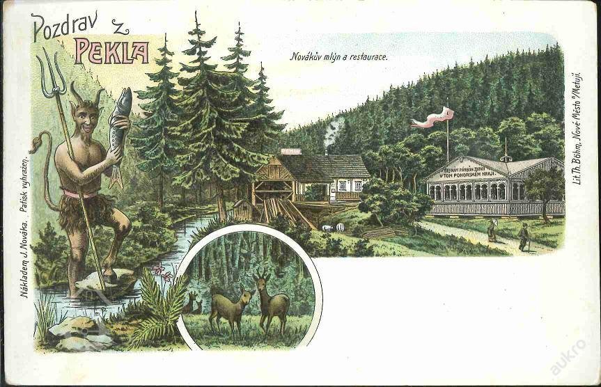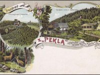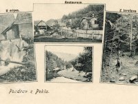 Peklo je jednak osada, jednak výletní restaurace, jednak údolí. Úbočí hlubokého údolí má z jedné strany vrcholný bod v Sendražském kopci a z druhé strany v krásné scenérii Koníčka, součásti to Hunčovských hor. V Pekle bývaly dva mlýny. Ve mlýně na Olešence, který Jurkovič přeměnil ve výletní restauraci nebo útulnu,  jak se dříve říkalo, se občerstvení podávalo už dříve. Nic zvláštního, ale voda nebo pivo a chléb s máslem a syrečky. To vše po pětikilometrové chůzi z Nového Města nebo z Náchoda přišlo k chuti.