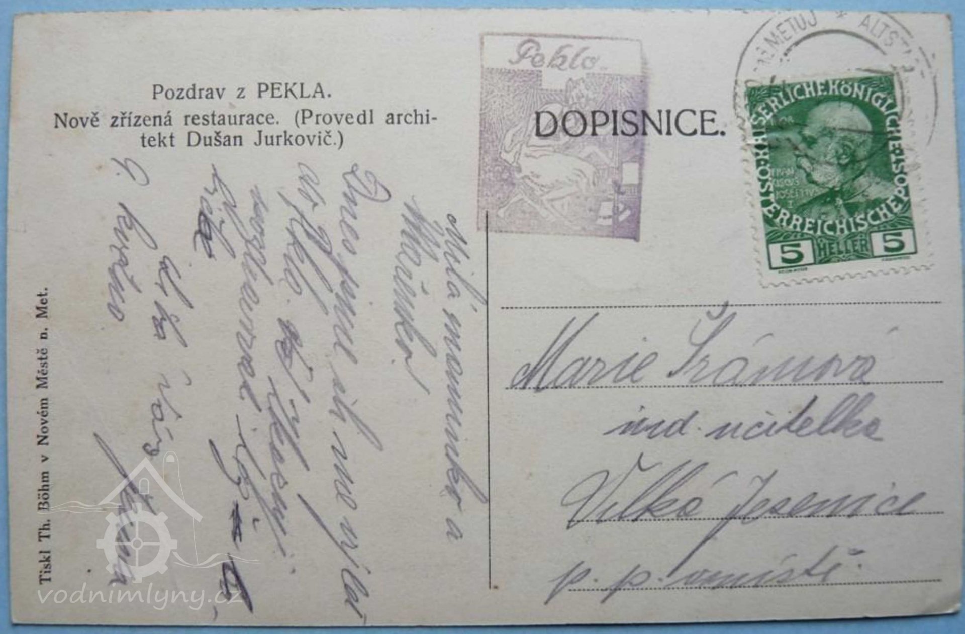 Na zakázku bratří Bartoňů z Dobenína, majitelů zámku v Novém Městě n. M., adaptoval slovinský architekt Dušan Jurkovič v letech 1908 - 1909 starý mlýn zvaný Pekelec při Olešence na útulnou restauraci. Jurkovičova žena pocházela z Náchodska, proto měl k Náchodsku vztah. Jurkovič vytvořil stavbu, která přesně zapadala do prostředí. U restaurace jsou zachovány mlýnské kameny jako stoly, mlýnské kolo je uvnitř na stropě a čerti chrlí z okapů vodu. Osada je připomínána již v r. 1415. Volně podle http://www.peklo-nemecek.cz/o-nas/