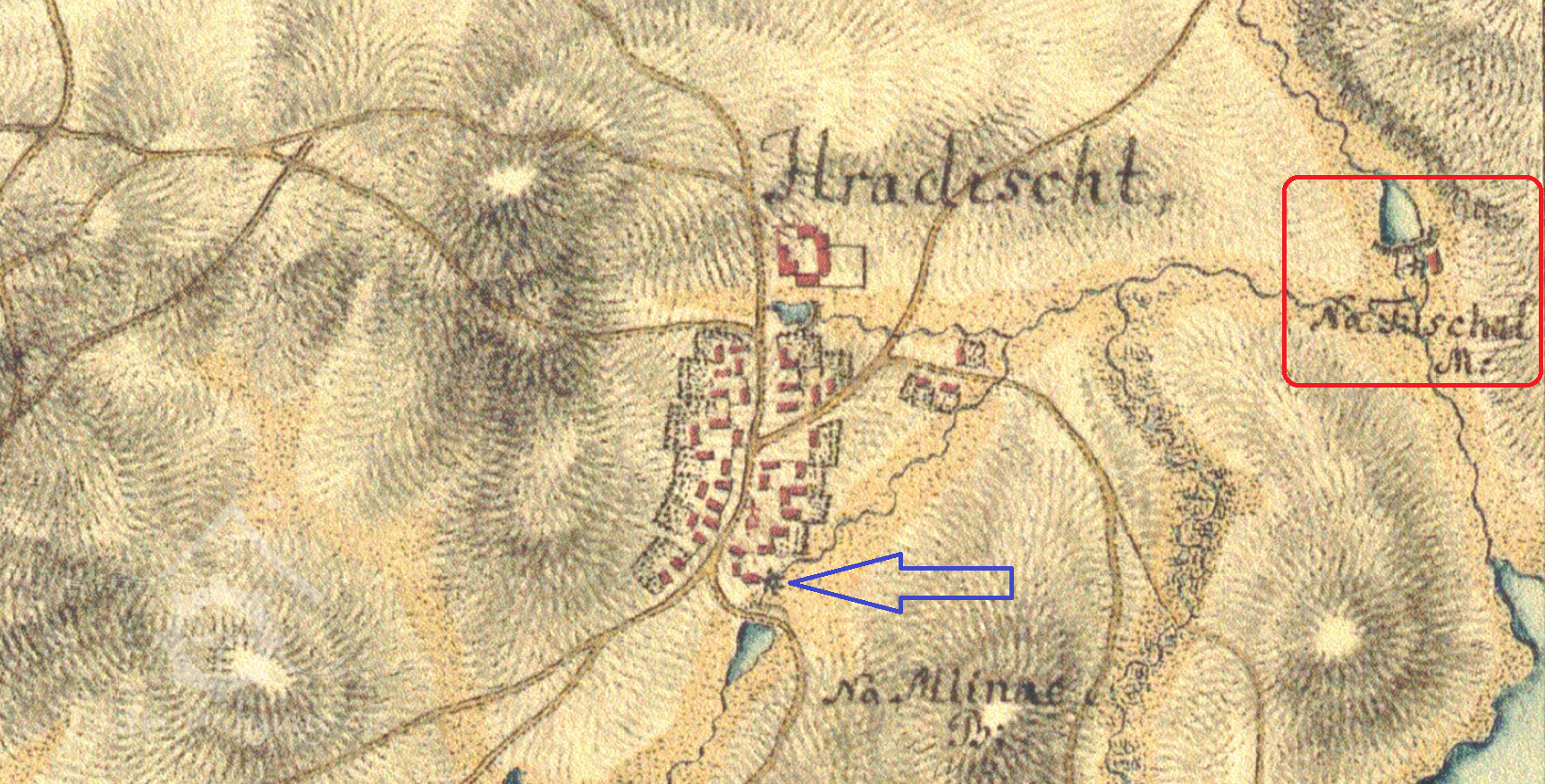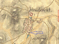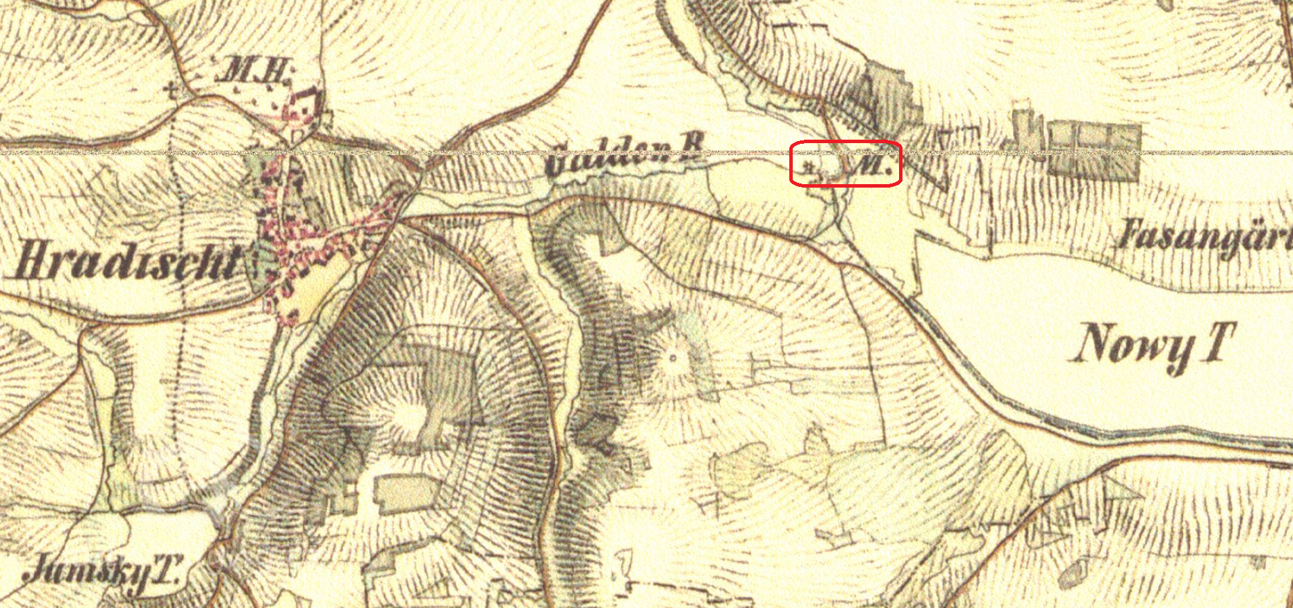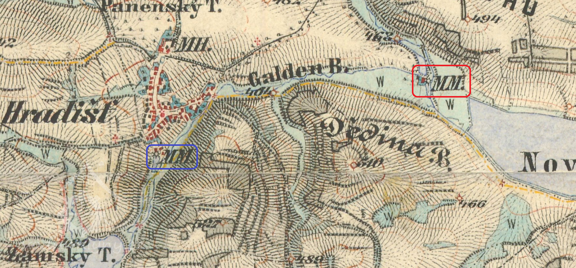 Mlýn na samotě východně od Hradiště, dnes nepříliš citlivě upraven pro rekreaci, v lednici instalováno improvizované vodní kolo z kovové cívky od kabelu.
