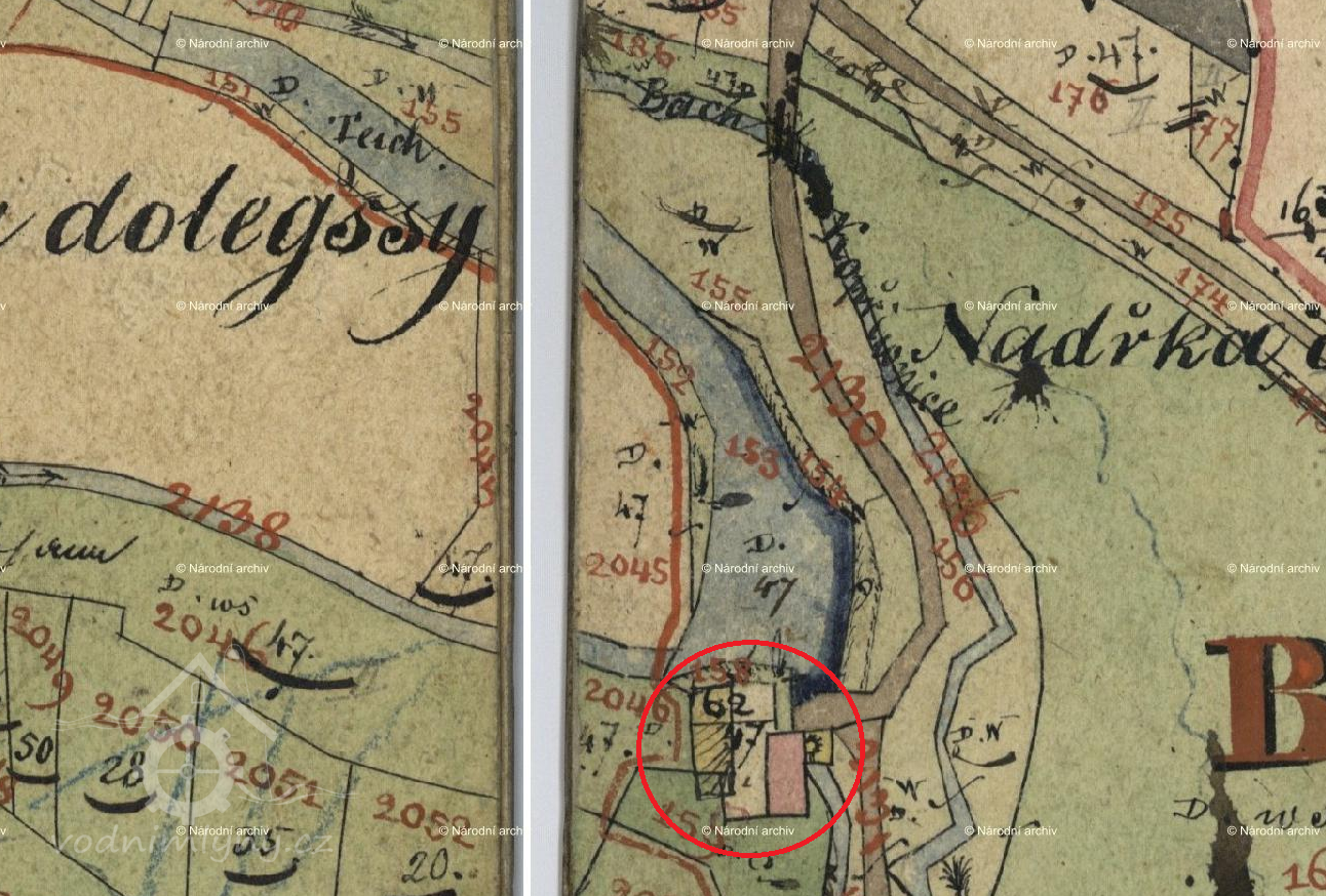 Popis1930: 1 kolo na svrchní vodu, hltnost 0,98 m3/s, spád 3,7 m, výkon 3,1 HP