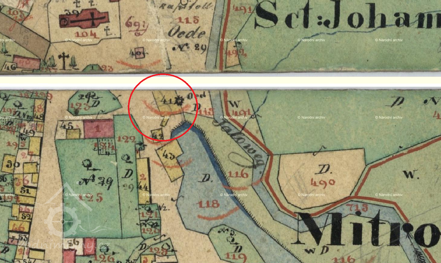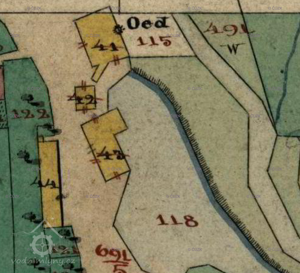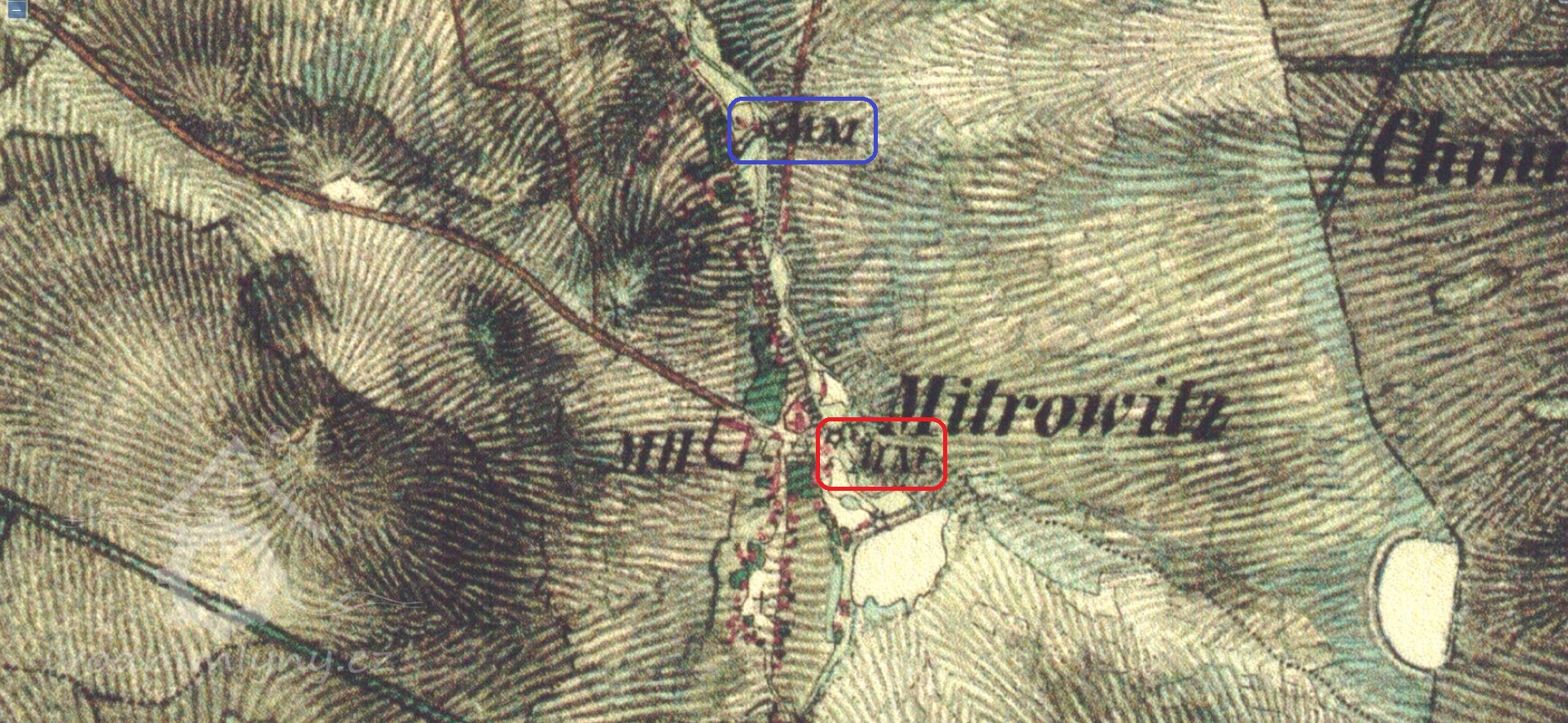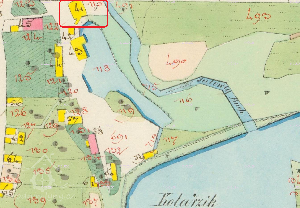 Původní dřevěný mlýn v Mitrovicích, ukončil činnost po pol. 19 stol., kdy jej postupně nahradil mlýn v čp. 83. Na originální mapě ke stabilnímu katastru vyznačen již jako zaniklá stavba. (Vendula Hnojská ho ale nezmiňuje.)