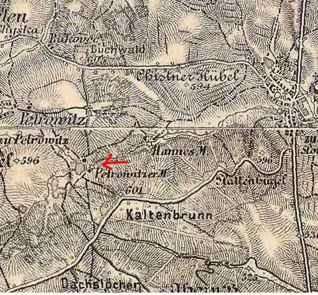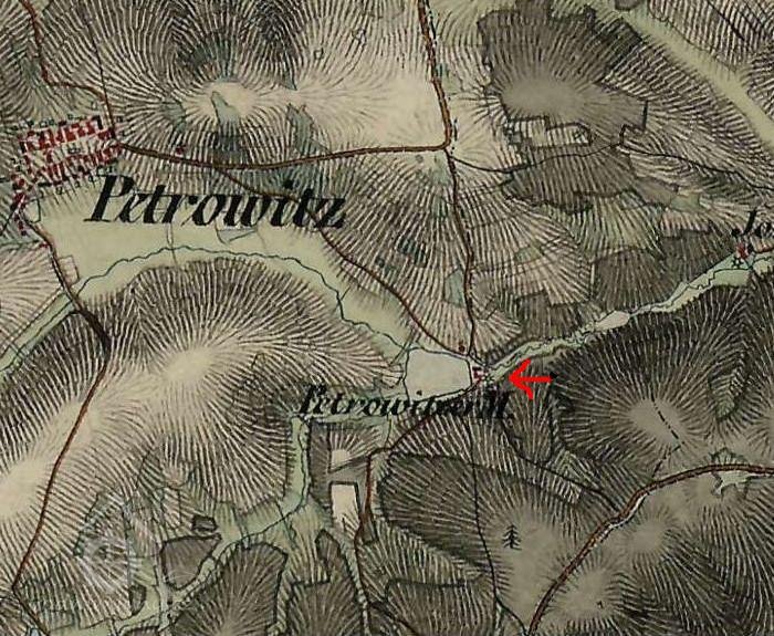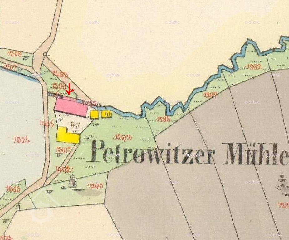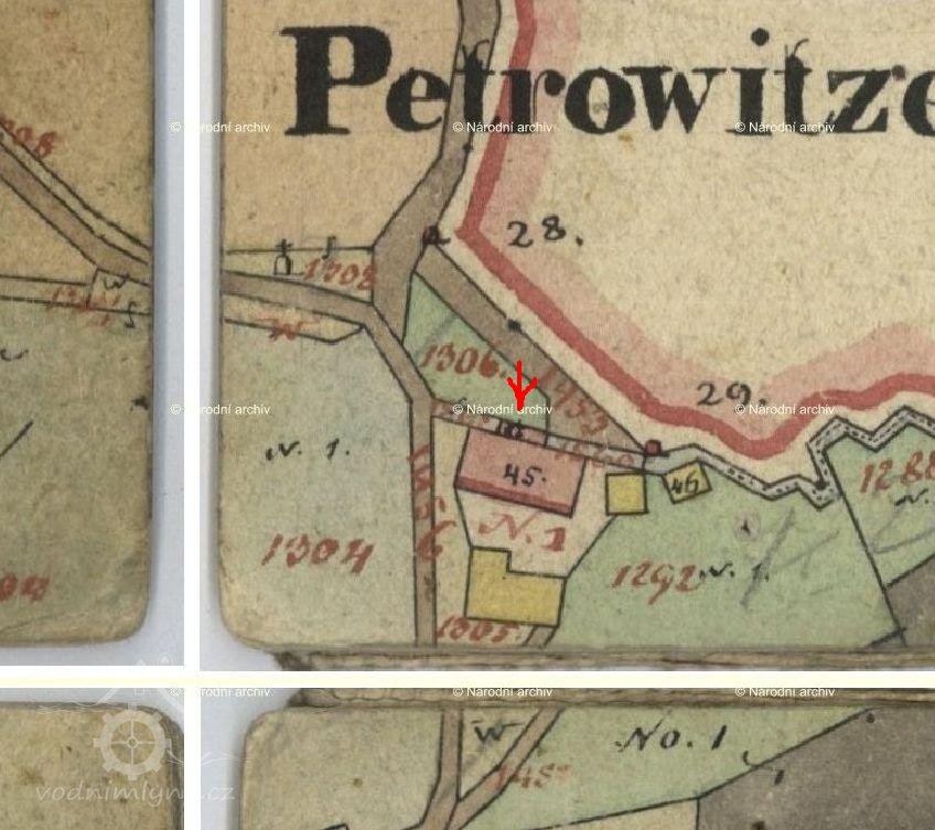 Petrovický mlýn je zobrazen na I. i II. vojenském mapování. Na císařském otisku a indikační skice z roku 1838 má čp. 1 a st.p.č.45. Majitelem mlýna a mlynářem v r. 1838 byl Josef Frühauf.