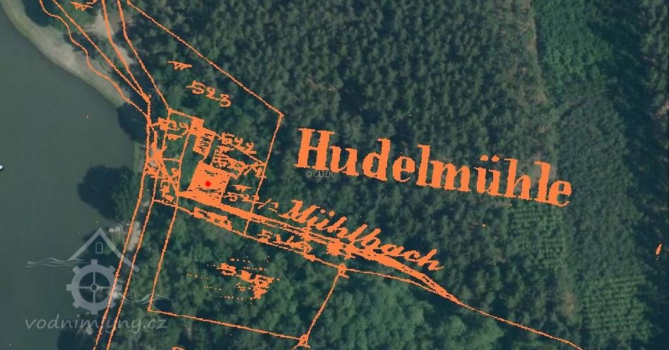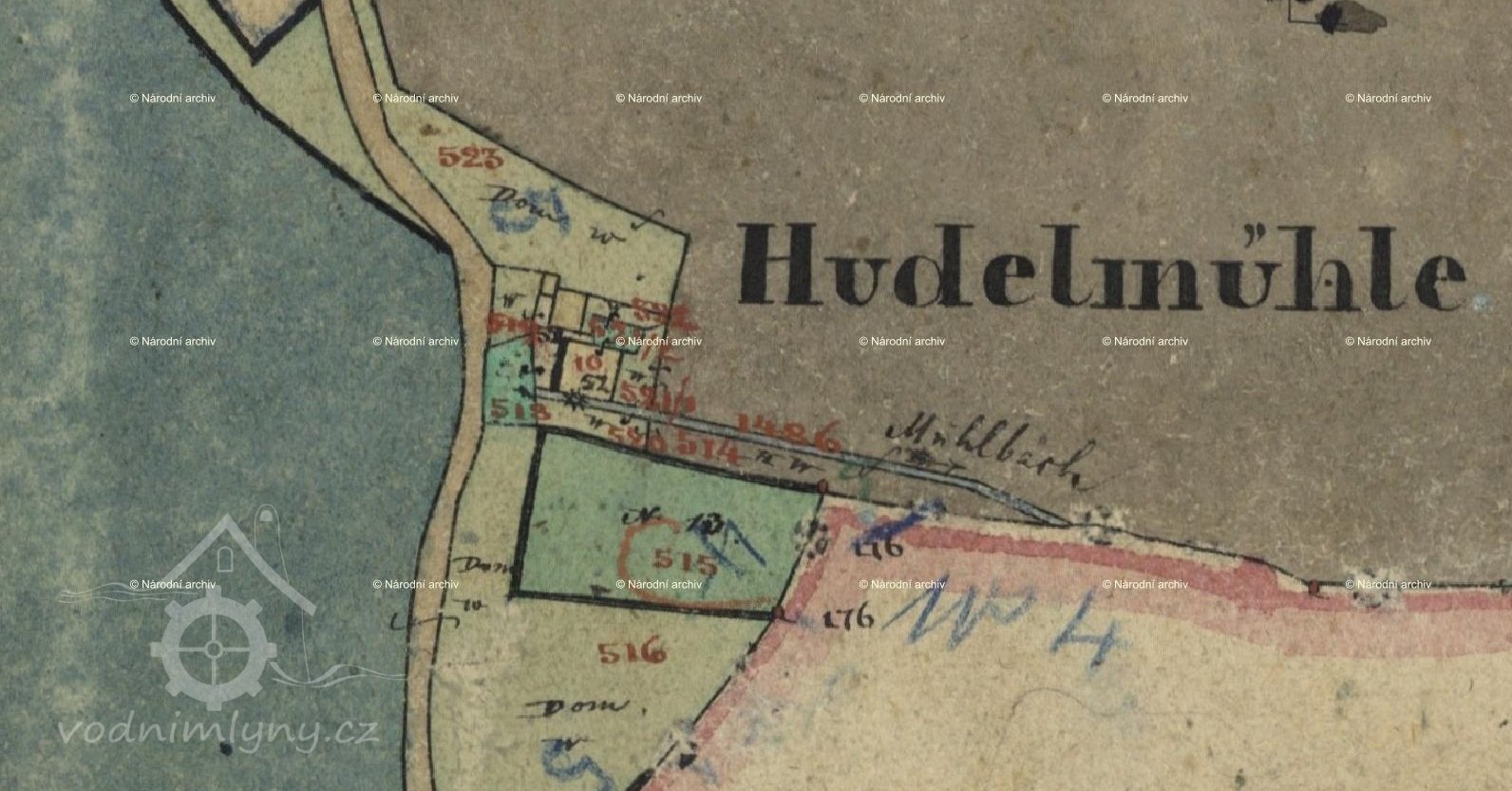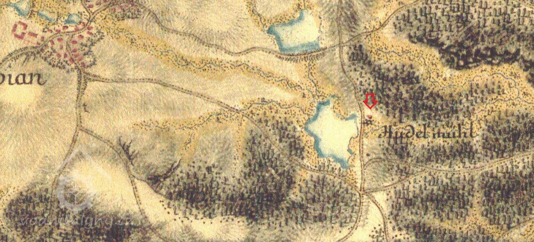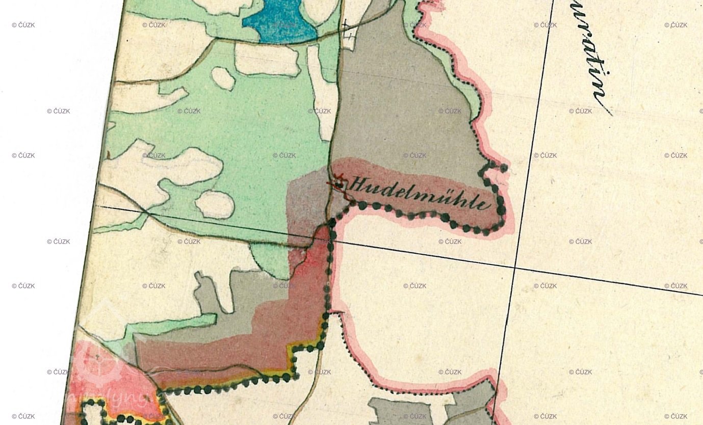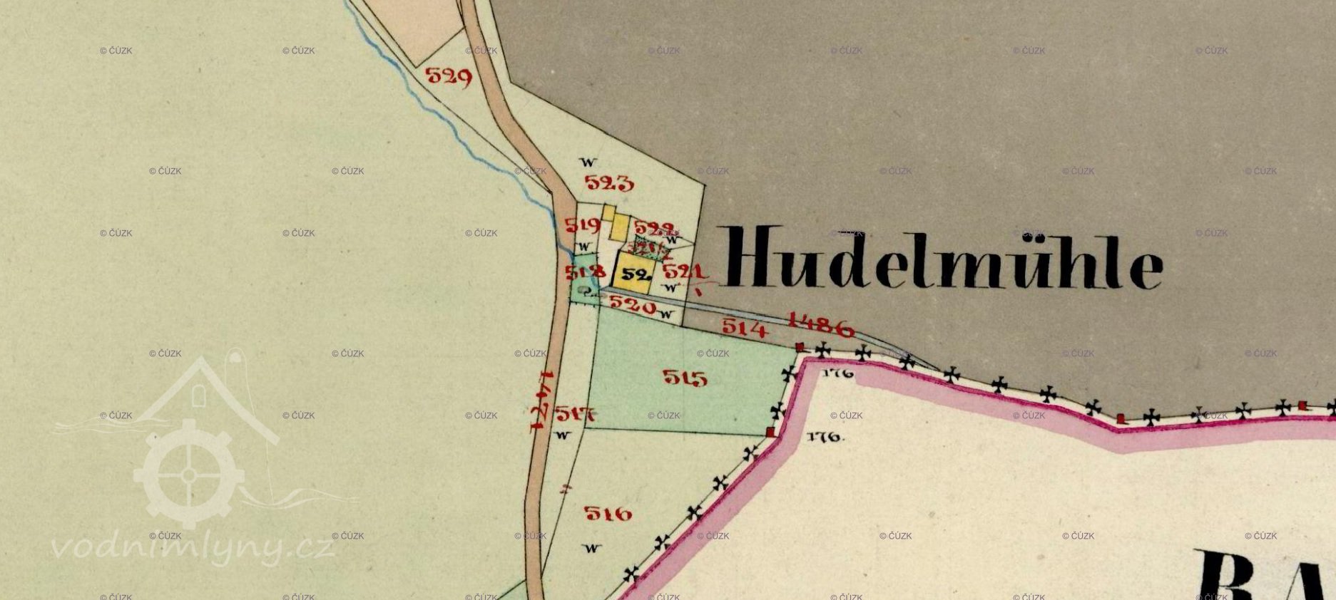 Císařský otisk, originální mapa a indikační skica stabilního katastru 1838 – východně od vsi na východní straně velkého rybníka je zakreslena spalná čtvercová budova s jedním kolem , vedle další menší spalná budova s malým dřevěným přístavkem, název je Hudelmühle, rybník v majetku Windischgrätzů z Kladrub. Mlynářem Joseph Arbes (1835-?) syn Kateřiny, dcery Mathiase Arbese ( 1777-1850 ). Následuje Martin Arbes (1840-?) syn Georga Arbese apoté Humbert Gross (1841-?) mlynář z Klatov.