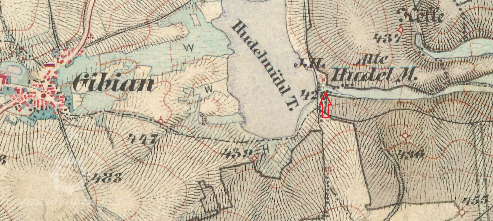 III. vojenské mapování – Františko-josefské ( 1877-1880 ) u rybníka s názvem Hudelmühl Teich jako Alte Hudel M. Vedle mlýna je zakreslena hájovna. Budovu mlýna koupil roku 1878 kníže Trauttmansdorff a jednu z budov přeměnil na myslivnu pro své panství.