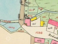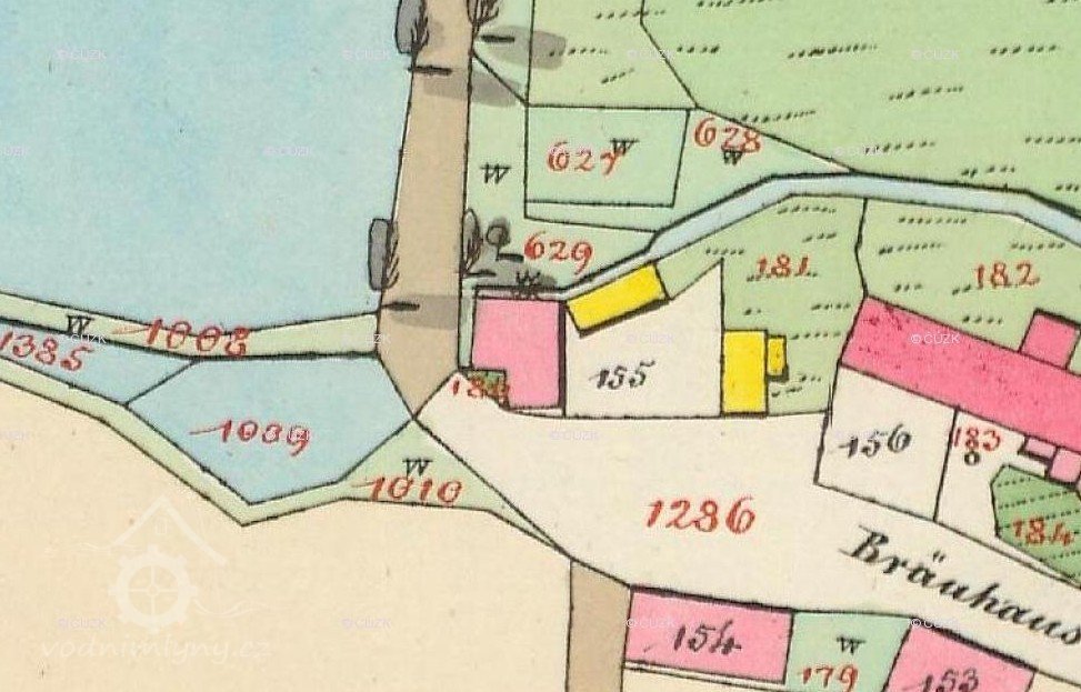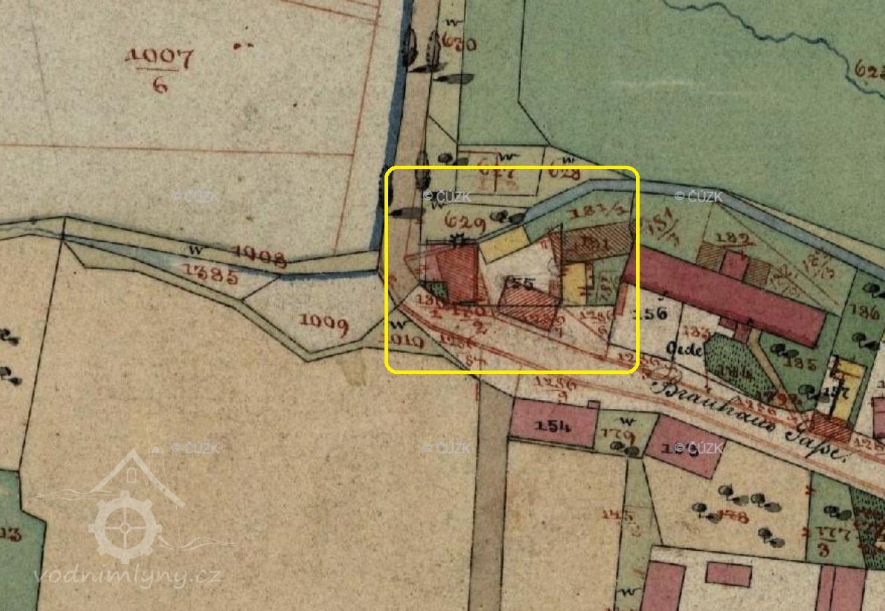 Katastrální mapa nám však dovoluje udělat si představu jen o pozdější novověké podobě mlýna, který zde stál až do přestavby v polovině 19. století. Je patrné, že šlo o zděnou stavbu o půdorysu písmene L, orientovanou rovnoběžné s hrází rybníka a doplněnou o dřevěný přístavek pily. Podle vodních knih (evidence vodních toků vedená okresním úřadem) se ve mlýně tehdy nacházela dvé obyčejná „česká" složení poháněná jedním kolem na vrchní vodu a pila, poháněná druhým kolem ve stejném náhonu. „České složení" byl jednoduchý mlecí stroj s jedním párem pískovcových mlecích kamenů, jednoduchým vysévacím zařízením bez mechanické dopravy zrna či šrotů do násypky. Nedalo se semlít na jeden zátah, polotovar se opakovaně domílal až na požadovanou jemnost. V mouce zůstávala spousta nečistot, výsledný produkt bylo nutno přesívat.