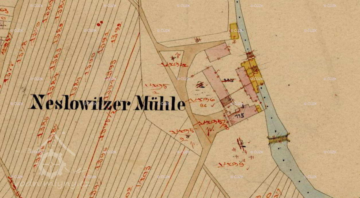 Klasicistní vodní mlýn na místě bývalé obce Neslovice. Mlýn patřil do soustavy středověkých mlýnů na na tzv. Krhovicko-jaroslavickém náhonu.