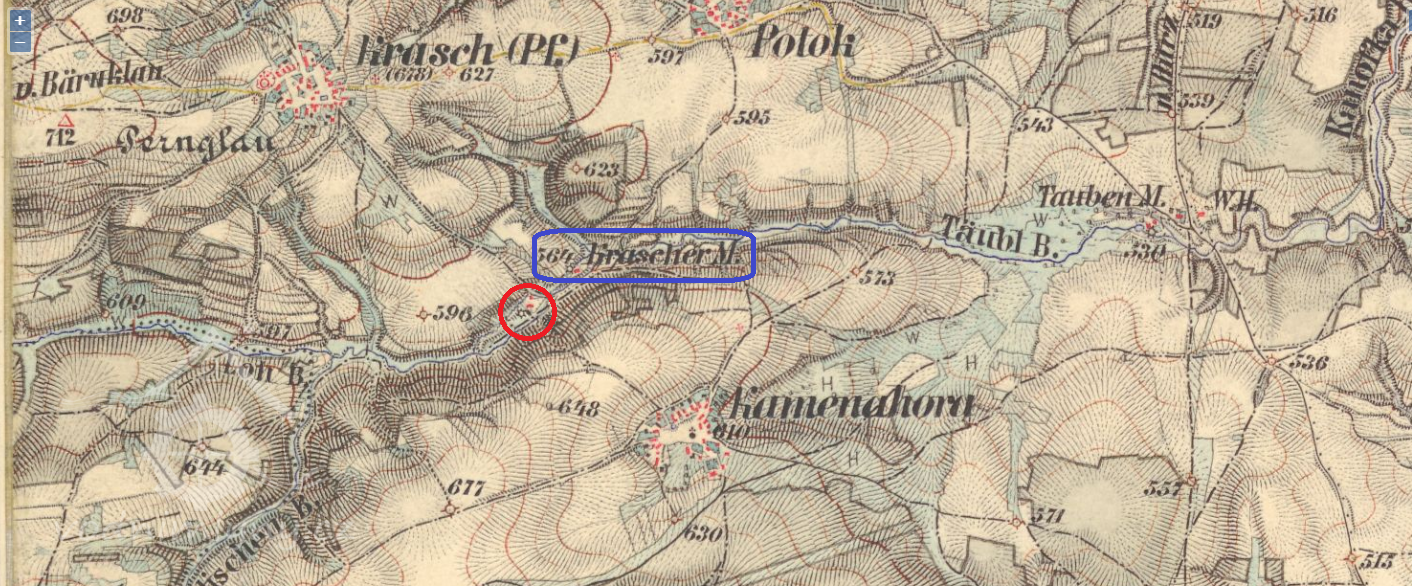 založil Karel Schmid (*4.4.1819, Březín čp. 4 - 1884), syn Josefa Schmida, krejčího a domkáře, 31.5.1853 oo Kateřina roz. Schlicková z Nového Městečka  (*1834)