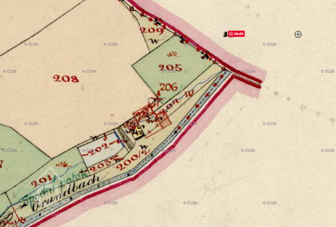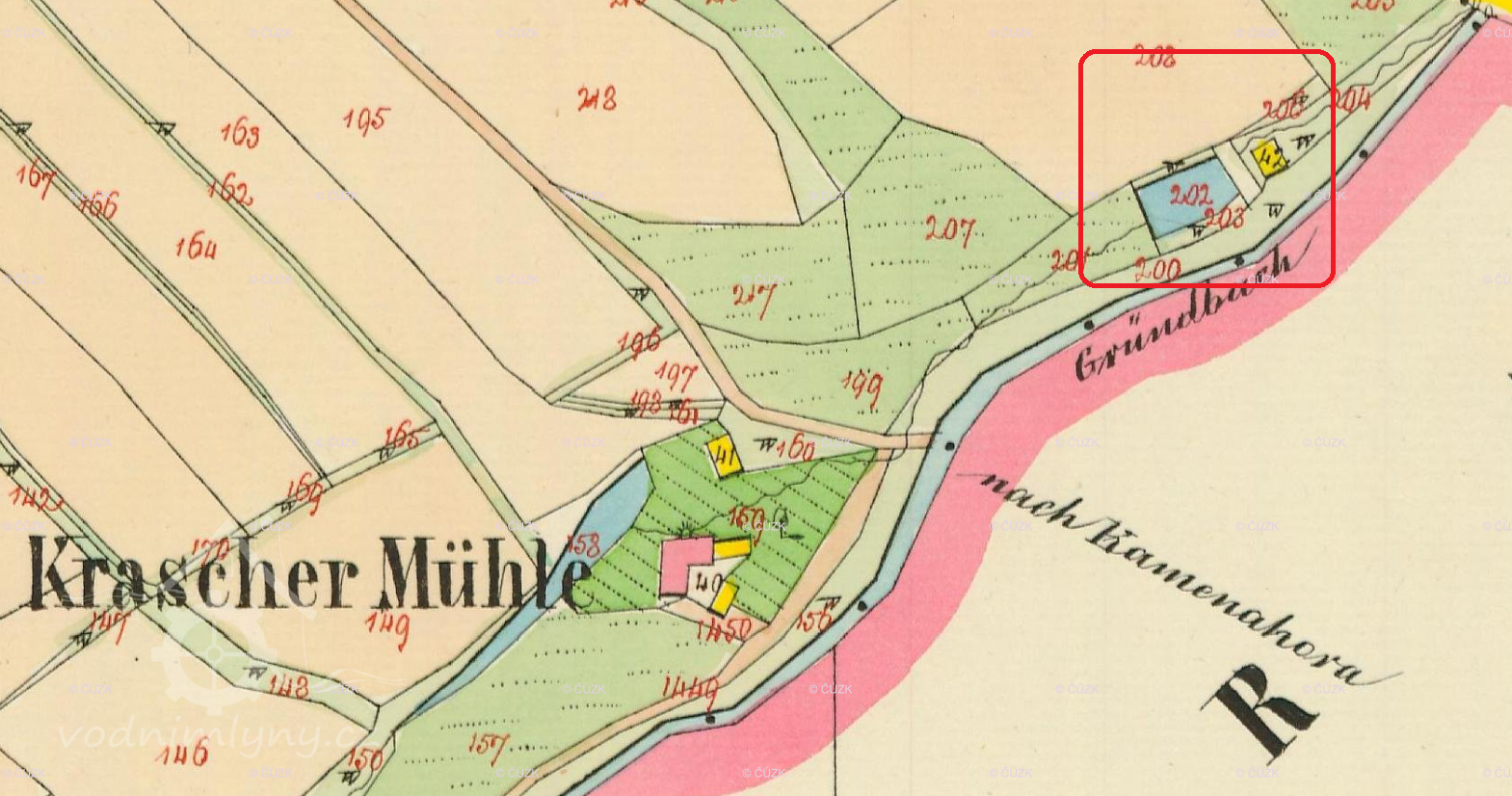 Novější mlýn z konce 19. stol., vzniklý rozšířením původní odloučené pily 200 m pod Krašovským mlýnem. Zanikl zároveň s ním po II. světové válce, k mlýništi dnes nevede žádná cesta.