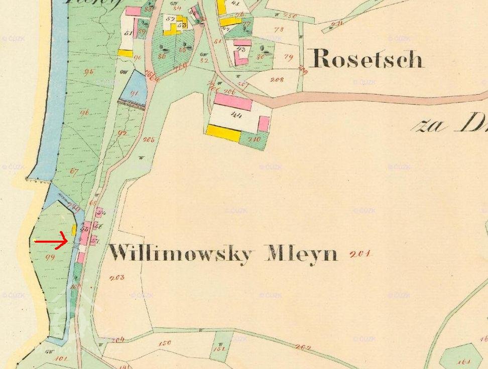 Popis1930: 1 kolo na spodní vodu, hltnost 2 m3/s, spád 1,5 m, výkon 12 HP