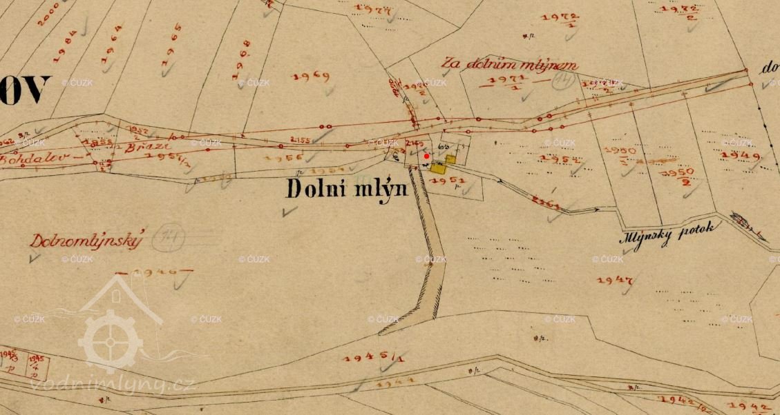 Dolní mlýn v Bohdalově pod Dolnomlýnským neboli Kněžským rybníkem je uveden na I. a na II. vojenském mapování. Patřil k majetku církve.
