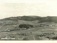 Pohled od západu, vlevo Strašín, vpravo Lazny, uprostřed na vršku kostel, 1938, © autor neznámý