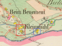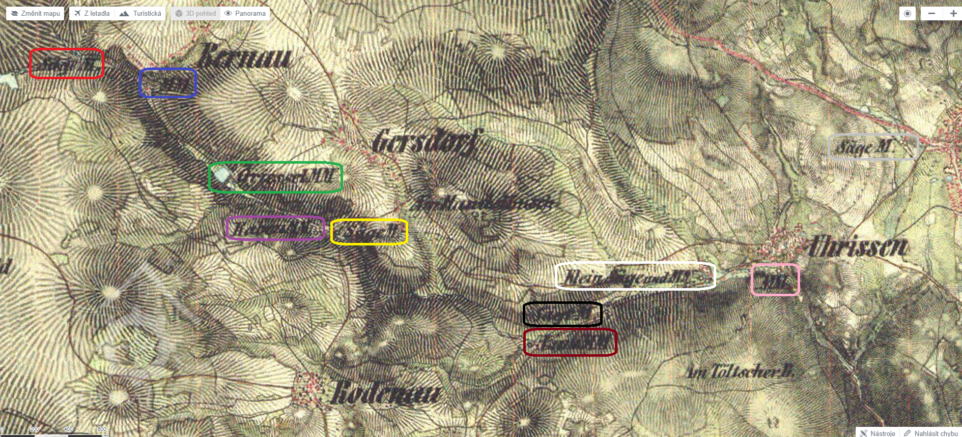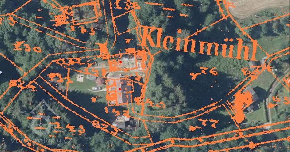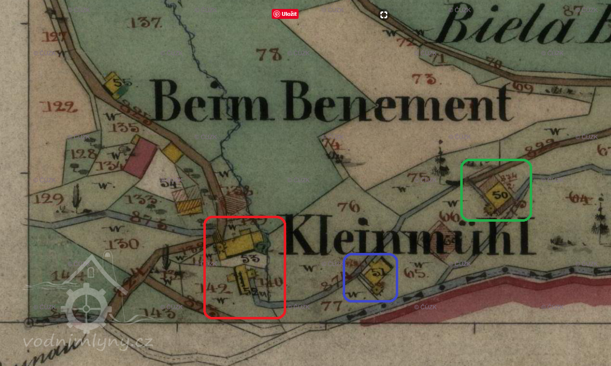 Löschnerův mlýn (červeně), Horní Siegertova pila (modře), Horní mlýn (zeleně), Griesselův mlýn (fialově), Havraní mlýn (žlutě), Springerův mlýn (hnědě), Linzův mlýn (černě), pila u Linzova mlýna (bíle), Malé mlýny (růžově), Richterův mlýn (šedě), Trexlerův mlýn (oranžově) a Mikulášský mlýn (azurově), III. vojenské mapování, výřez, 1877-1880, © mapire.eu