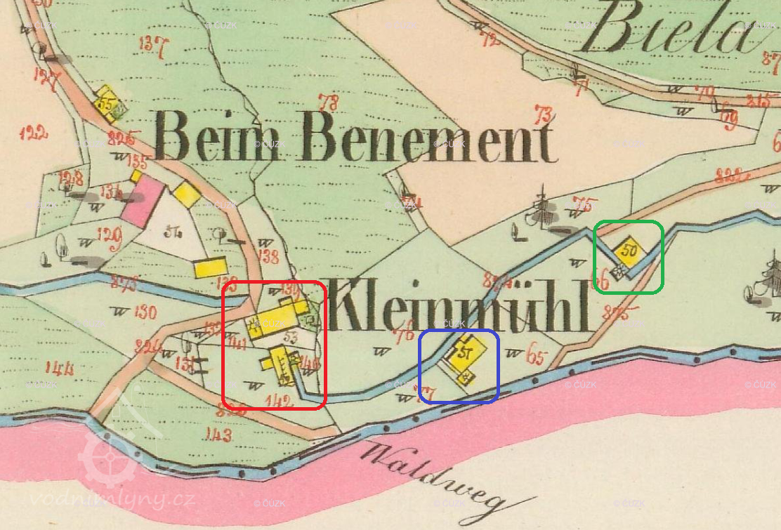 I. (červeně), II. (modře) a III. (zeleně) malý mlýn v Orasíně, originální mapa stabilního katastru, výřez, 1842, © archivnimapy.cuzk.cz