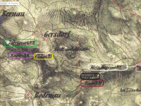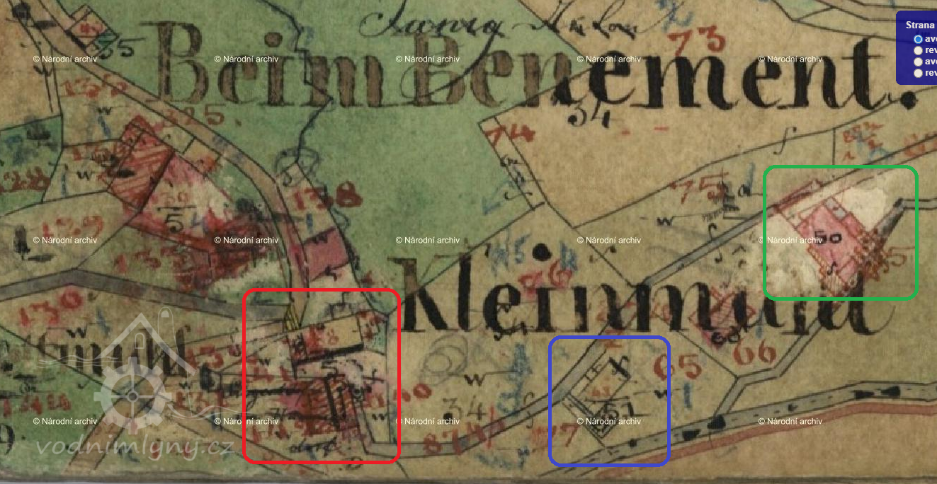 I. (červeně), II. (modře) a III. (zeleně) malý mlýn v Orasíně, císařský povinný otisk, výřez, 1842, © archivnimapy.cuzk.cz