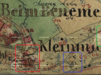 I. (červeně), II. (modře) a III. (zeleně) malý mlýn v Orasíně, indikační skica, výřez, 1842, © archivnimapy.cuzk.cz