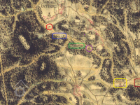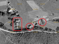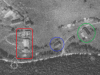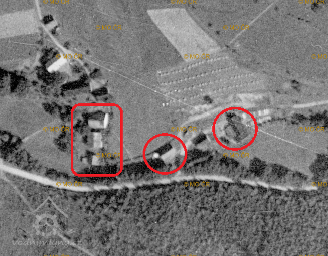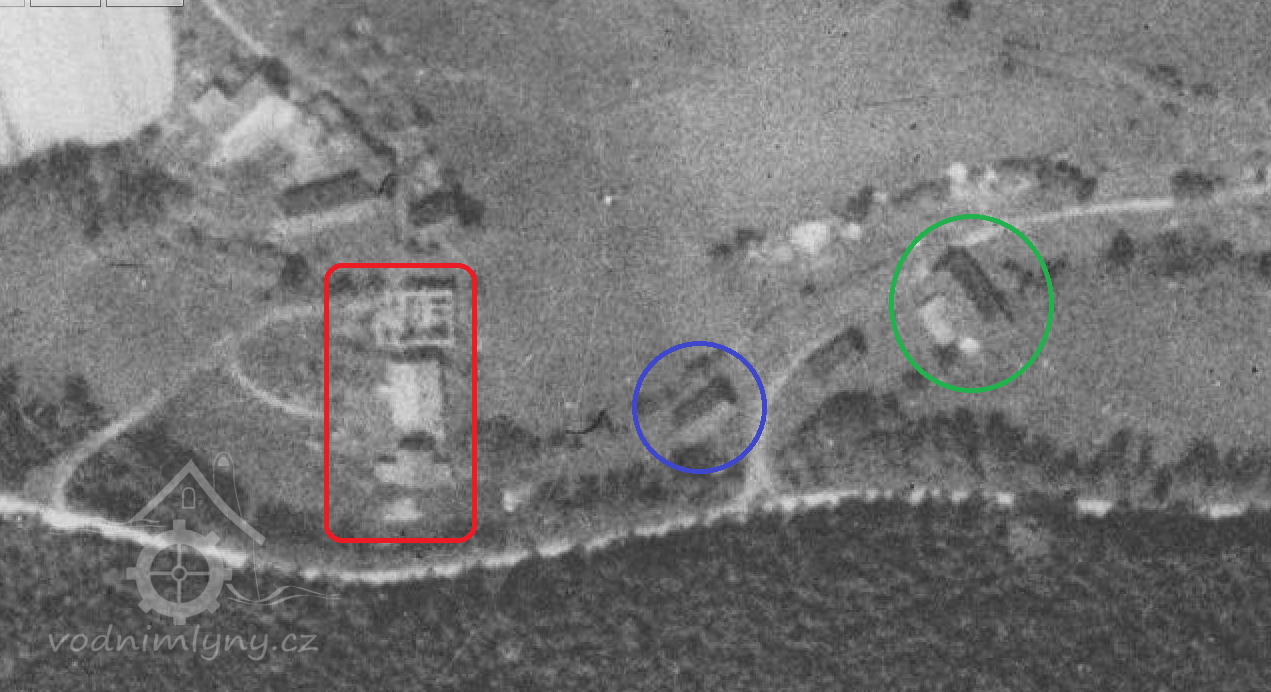 I. (červeně), II. (modře) a III. (zeleně) malý mlýn v Orasíně, letecký měřický snímek, výřez, 1953, © kontaminace.cenia