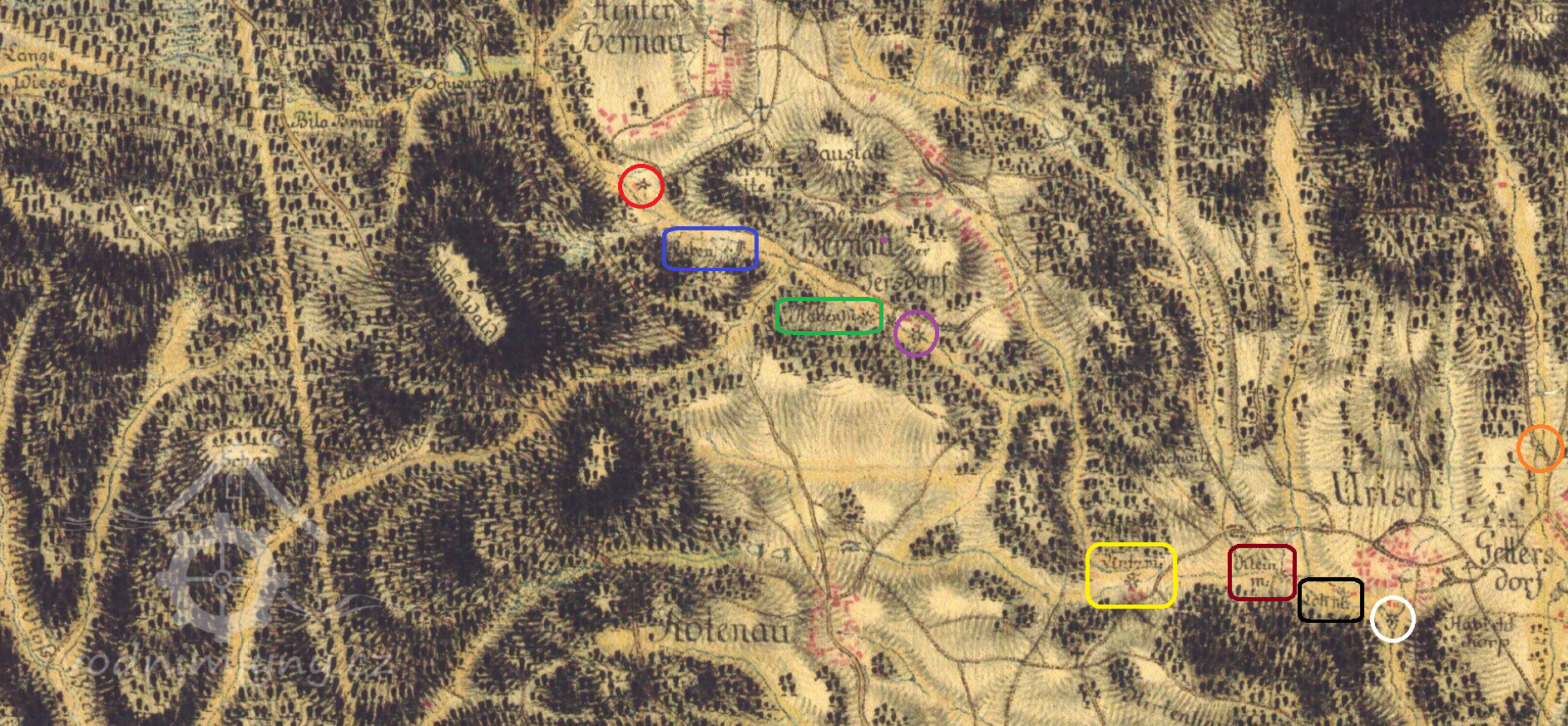 Löschnerův mlýn (červeně), Griesselův mlýn (modře), Havraní mlýn (zeleně), Springerův mlýn (fialově), Linzův mlýn (žlutě), Malé mlýny (hnědě), Tříselník (černě), Richterův mlýn (bíle) a Mikulášský mlýn (oranžově), I. vojenské mapování, výřez, 1764-1768, © oldmaps.geolab.cz