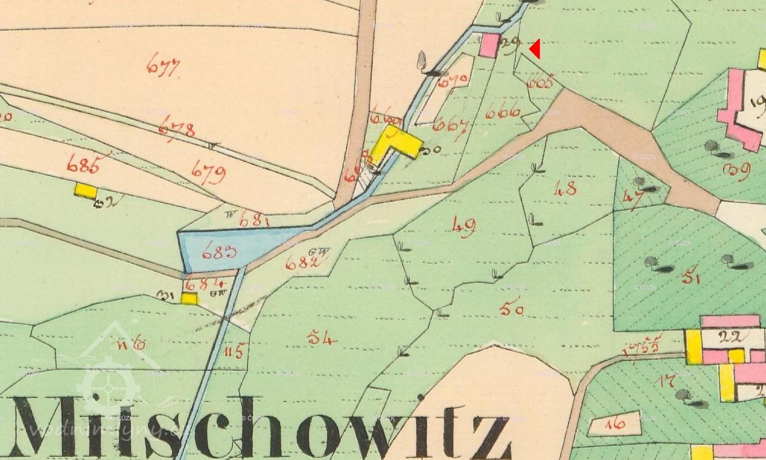 Voda potoka Jánského protékají nádrží na kat.č.683 a částečně na kat.č.687 vedena je přímo do zdrže před mlýnem. Nádrže jsou určeny k nashromažďování vody pro pohon mlýna za dob podnormálního přítoku. Vodní plocha nádrží je 68 m2 a obsah 68 m3. Závodní stavidlo je 30 cm široké a 20 cm vysoké. Vantroky přivádějící vodu ze zdrže před mlýn k závodnímu stavidlu jsou 80 cm široké a 76 cm vysoké. Vodní kolo na svrchní vodu má průměr 4,2 m, šířku 0,5 m s hloubkou korečků 0,24 m. Spád vody činí 4,76 m a při průtoku 74 l/s činí výkon 3,05 HP. Náhradní pohon mlýna není. Pevný bod v podobě kramle zasazen do zdi mlýna.