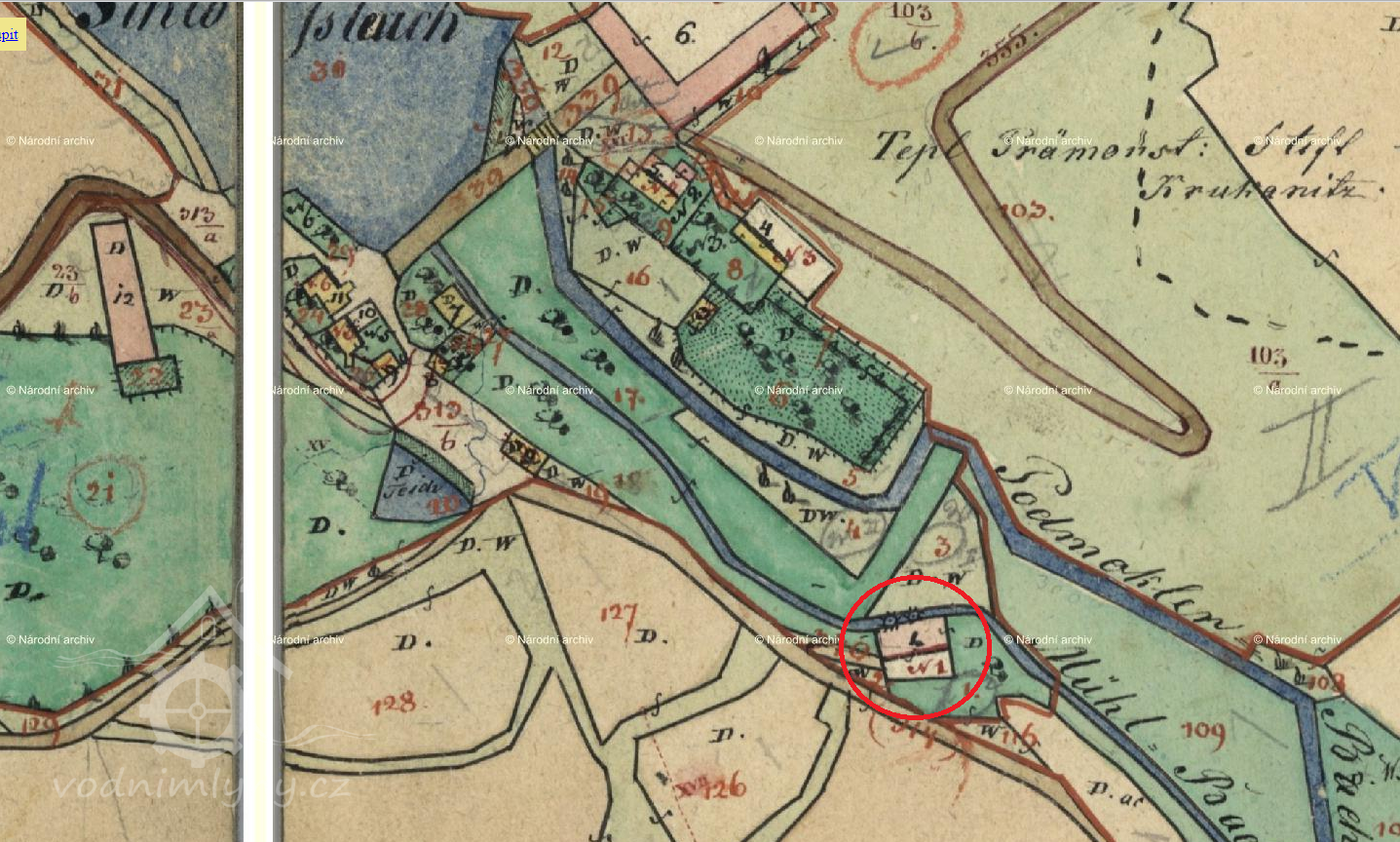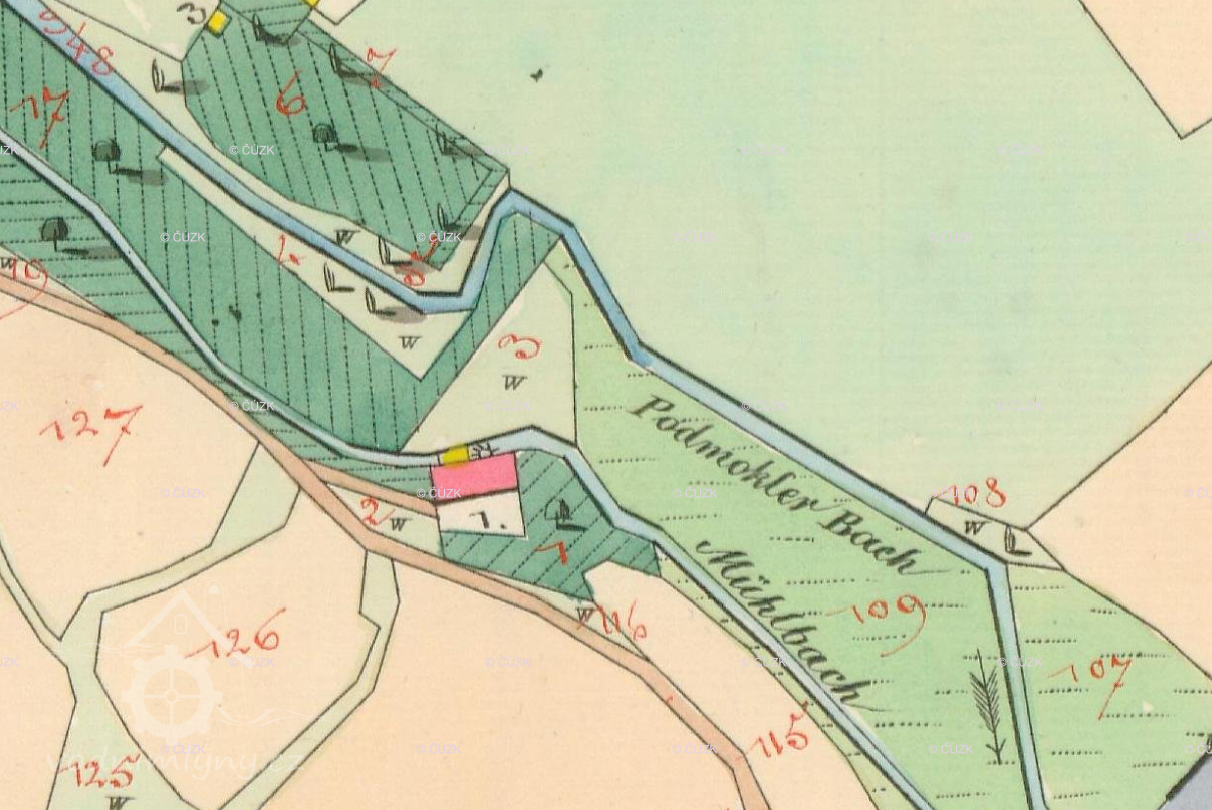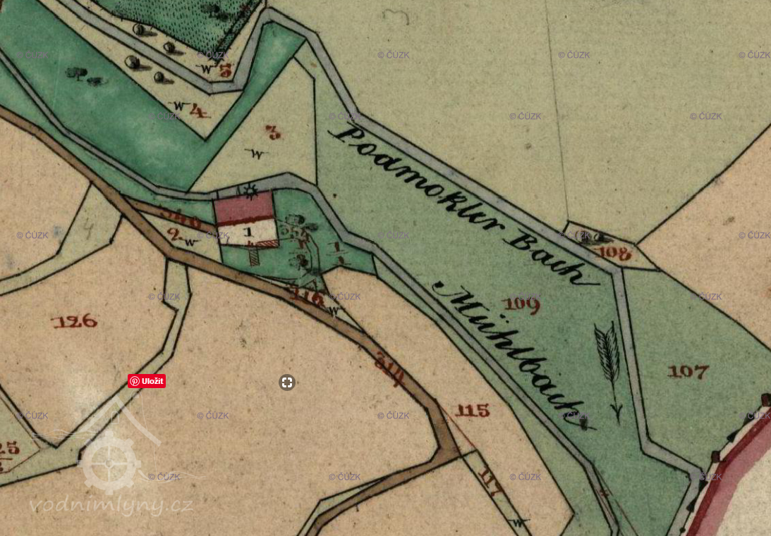 Popis1930: 1 kolo na svrchní vodu, hltnost 0,125 m3/s, spád 4,5 m, výkon 5,07 HP