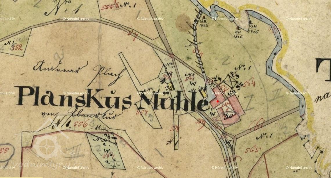 Několik objektů,zahrnujících mlýn,obytná a hospodářská stavení a pilu je zakresleno na mapě Stabilního katastru:Čechy-5610-1-Ovesné/Haberles/,mapový list č.004.K jednotlivým nemovitostem: