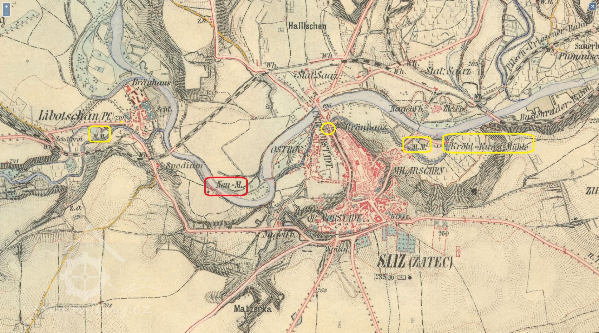 Kröbl-Mühle č. 624 - Turbínový mlýn Karla Kröbla, obnoven v roce 1886, dříve Dolní Neumühle) s vlastní mlýnskou strouhou na předměstí. Dnes AGRO Teplice.