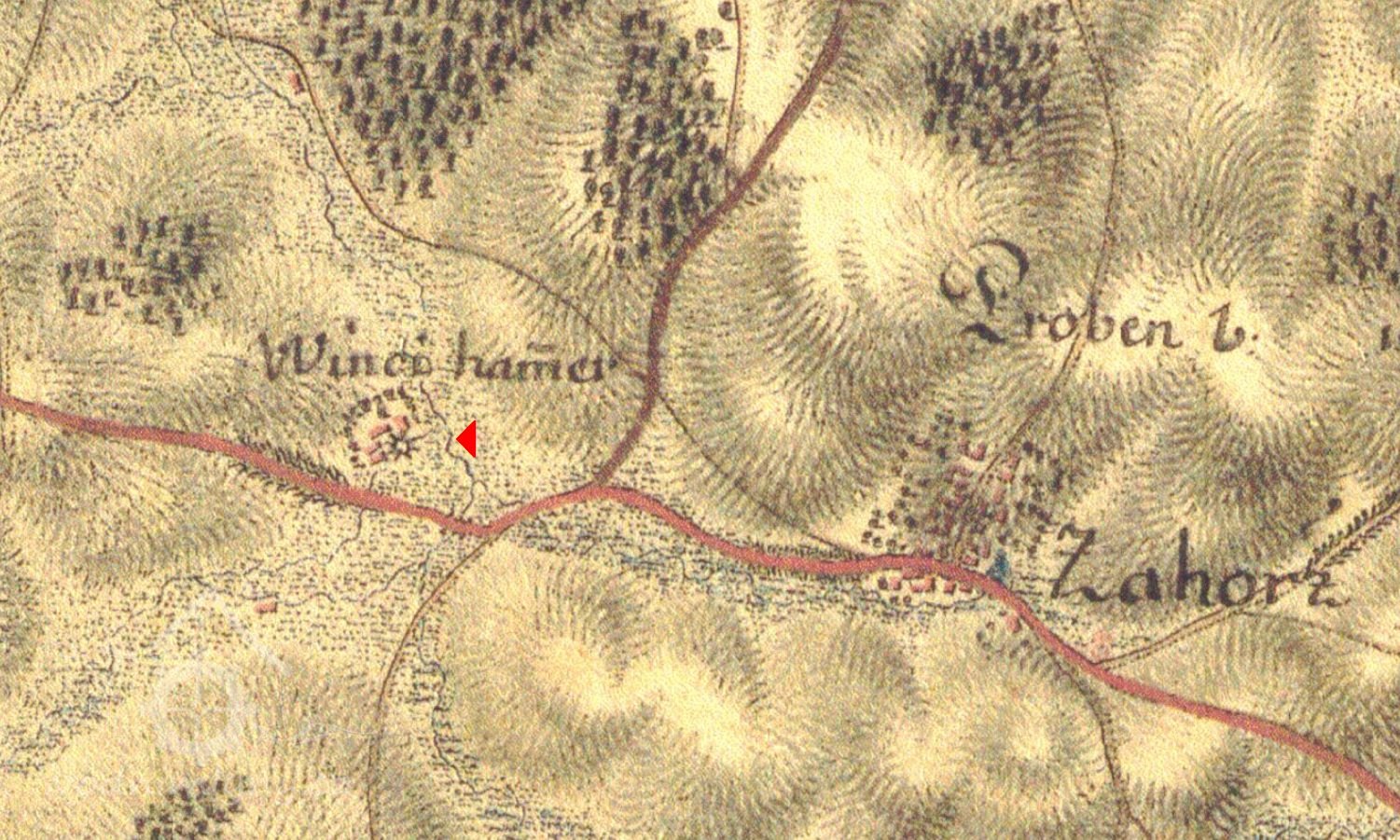 Vody Zlatého potoka tečou od Planského mlýna k dalšímu mlýnu, který je využíval - Winzigovu mlýnu. Dnes je na samotě "U mlýna" pod Zahořím zachována obytná a hospodářská část. Literatura udává jeho existenci v r. 1702. Není však zřejmé zda byl hamrem a mlýnem od začátku nebo až hospodářským vývojem. V roce 1930 měl mlýn jedno vodní kolo a byla při něm i pazderna v r. 1932 zrušená.