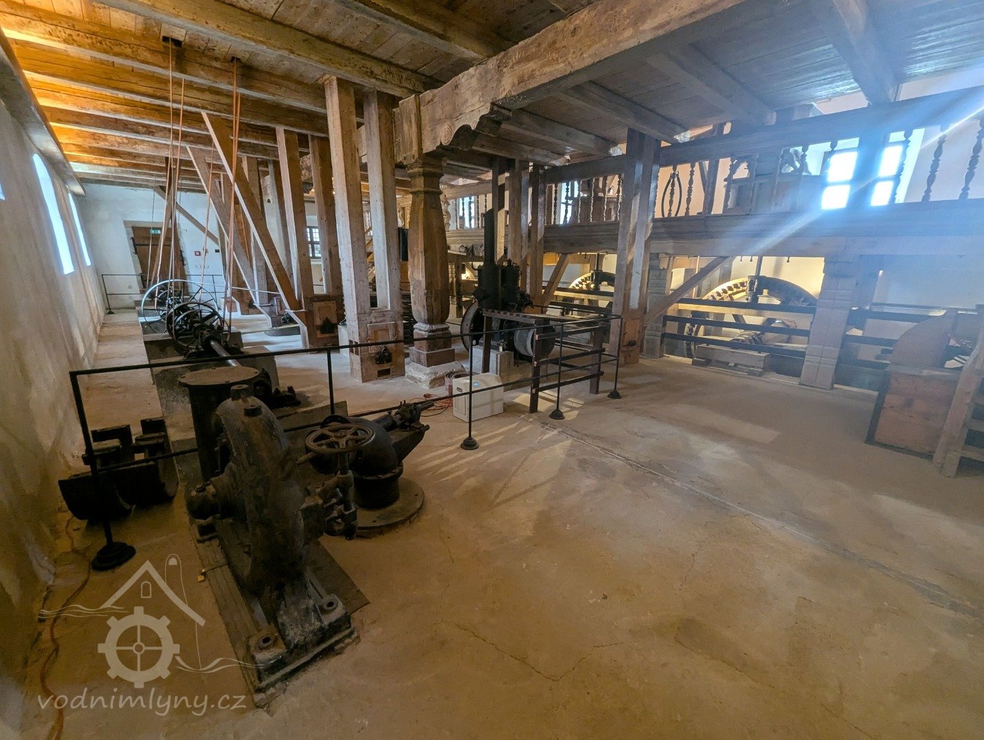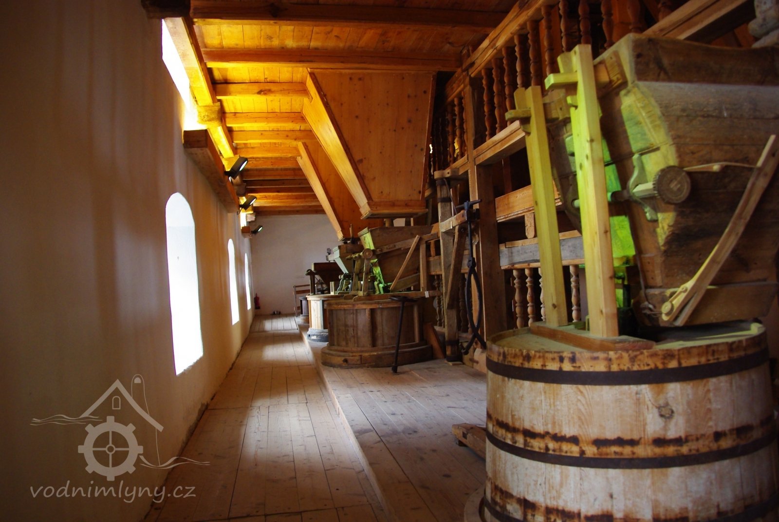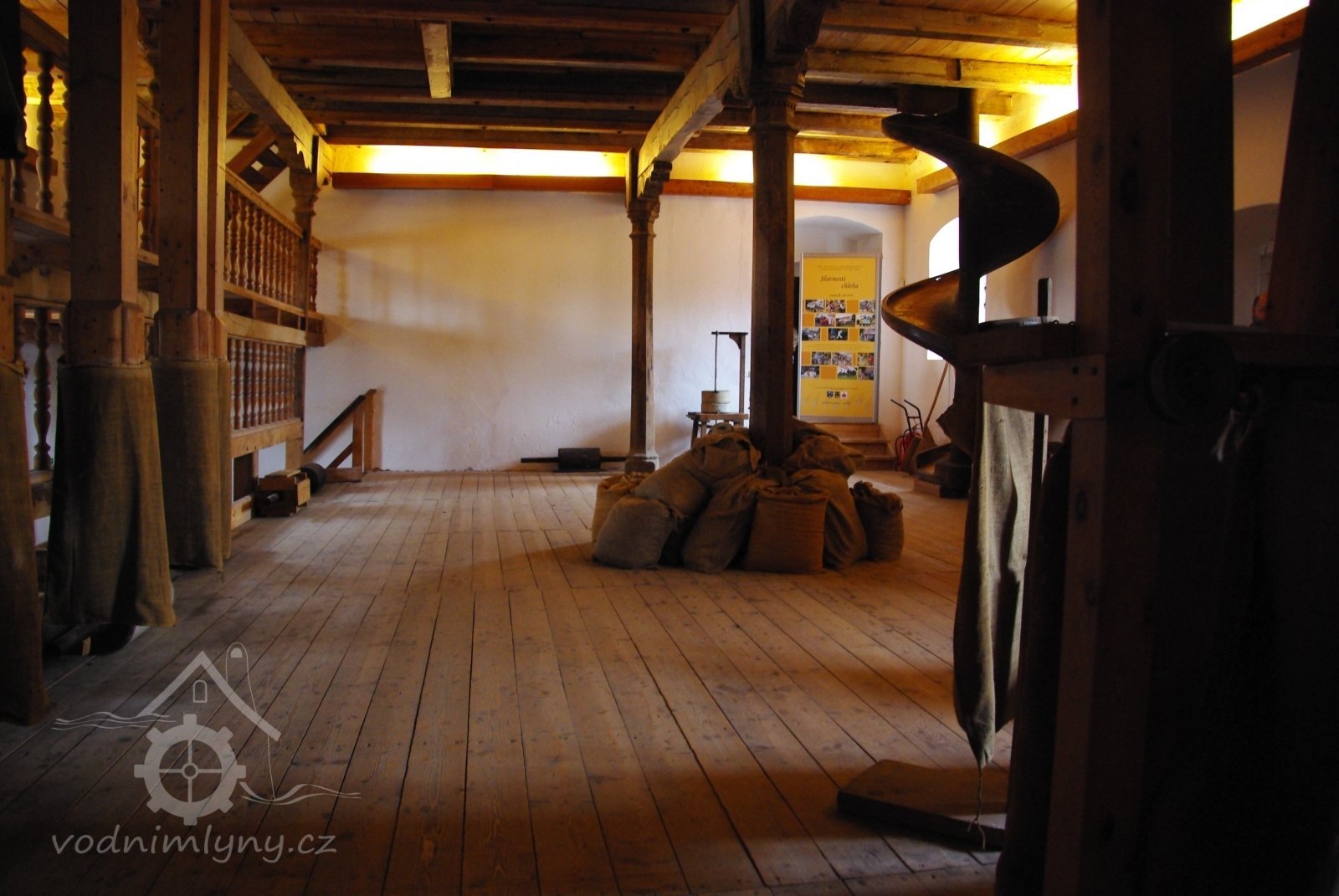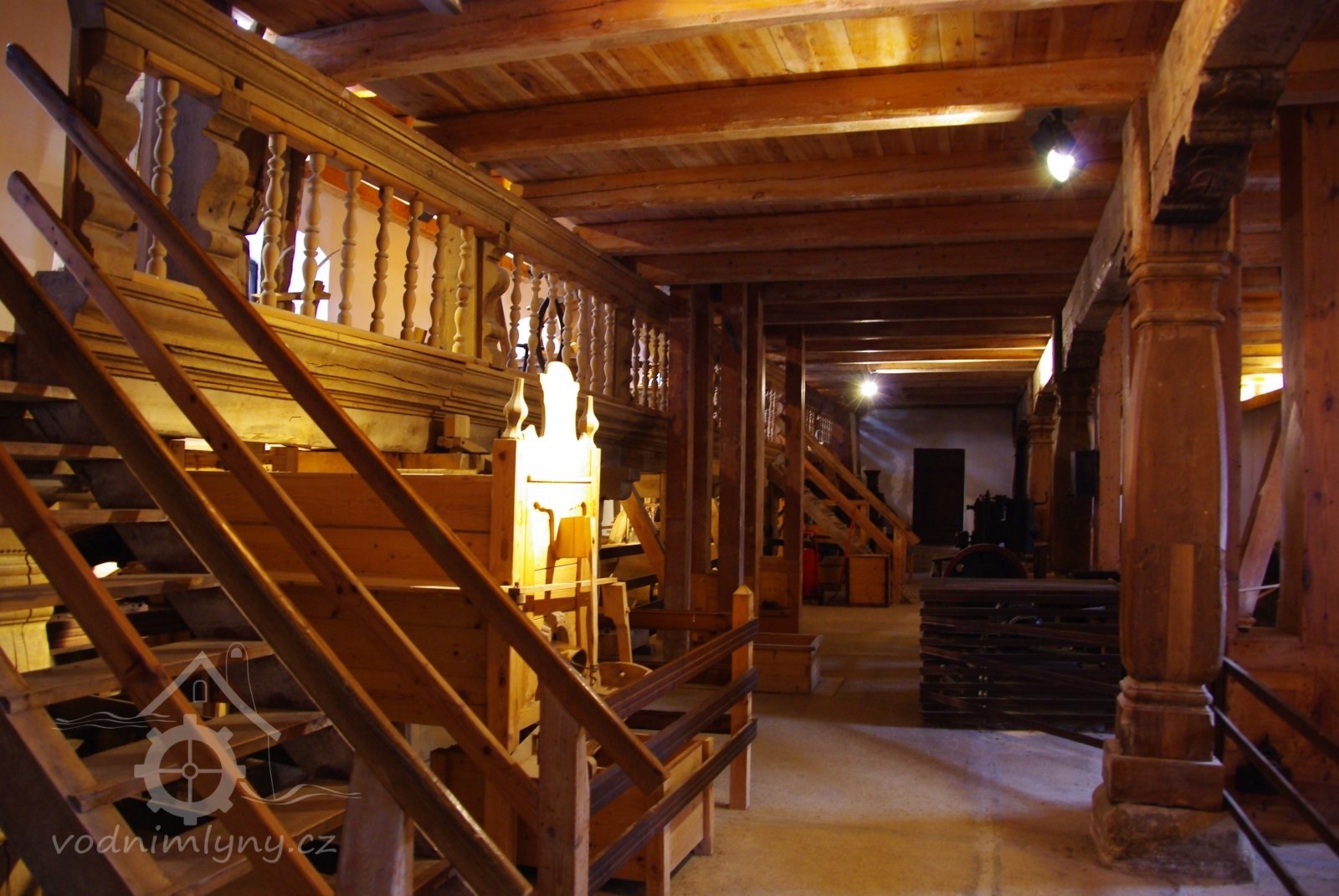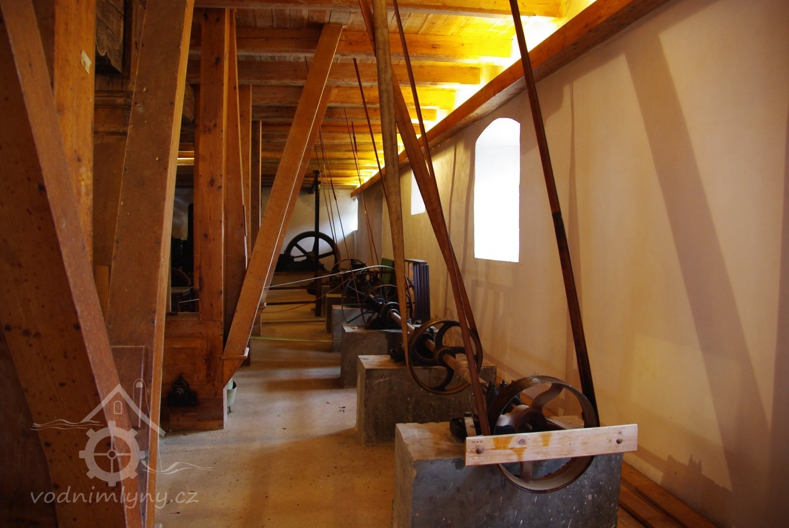 V přízemí vlevo je průjezd valeně klenutý, z něhož je přístupná stará mlýnice a přes přemostěný náhon louka za mlýnem. Mlýnice je prostor jdoucí přes dvě patra s trámovým stropem vyřezávaným (na stropním trámu vzadu proti vchodu je vyřezán nápis: FJ 1738 FS) a vším mlýnským zařízením.