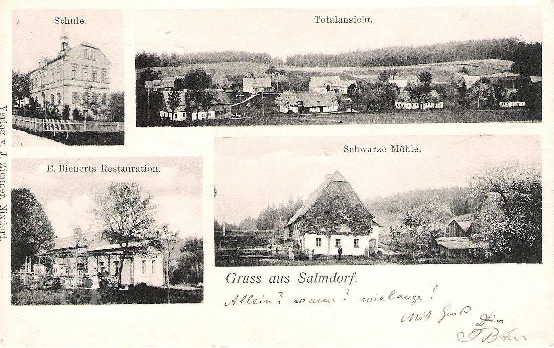 Černý mlýn (č.p. 1) byl po určitý čas sídlem salmovského rychtáře (před jejich sloučením s Mikulášovicemi roku 1850). Mlýn zanikl po 2. sv. válce.