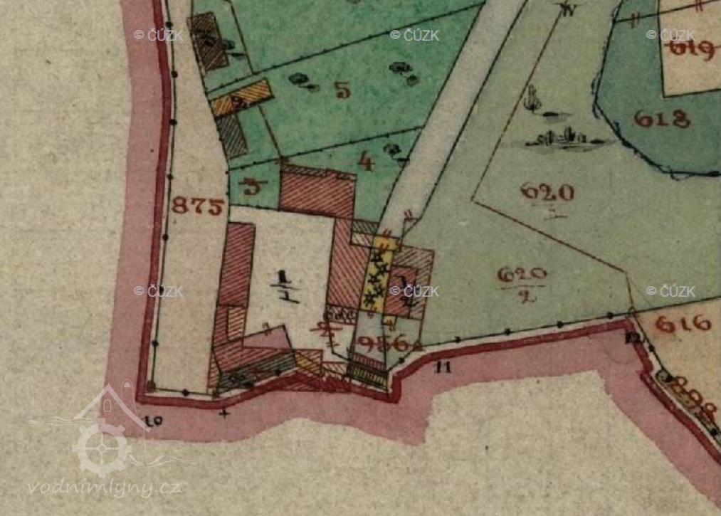 Vodní kniha politického okresu Hradec Králové: ve mlýnici „na levé straně 2 obyčejné stroje, 2 cylindry [ ... ] se nachází“. Stávala zde tedy dvě jednoduchá poloumělecká složení, tvořená dvěma páry mlecích kamenů („obyčejné stroje“) a hranolovými vysévači („cylindry“).