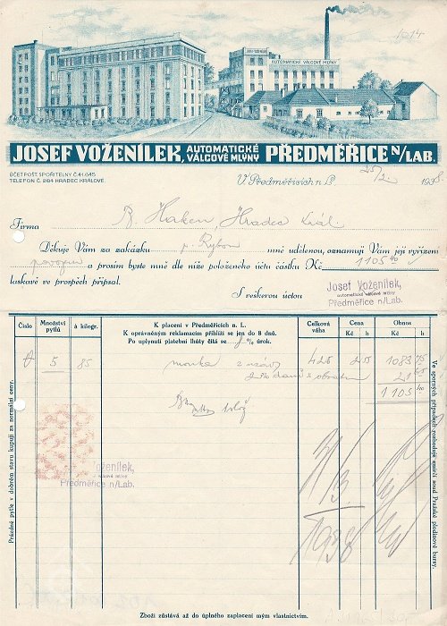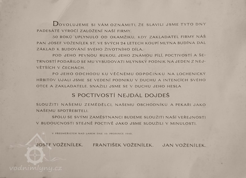 Starý dřevěný mlýn zakoupil v r. 1925 zakladatel firmy Josef Voženílek a přebudoval ho na moderní mlýn.