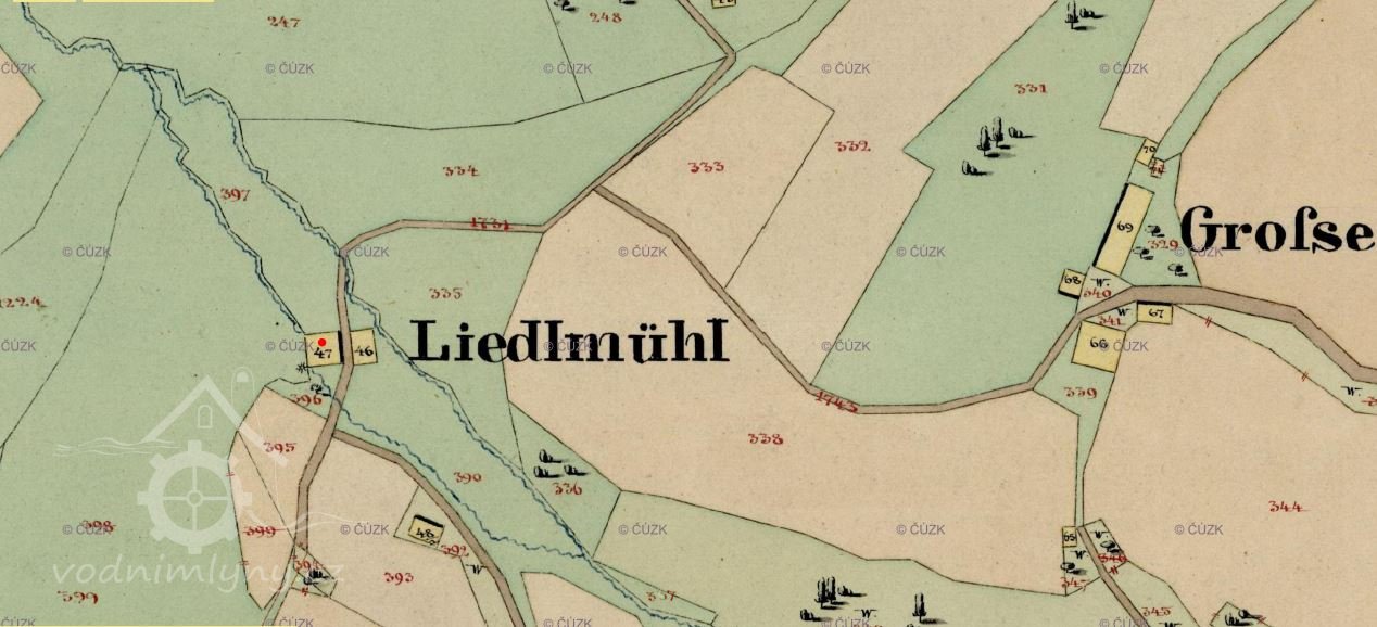 Na mapě Stabilního i Pozemkového katastru je uveden název "Liedlmühl".V období 1826-1945 byl mlýn a další stavby v majetku rodiny Pflanzer,posledními vlastníky byli od r.1925 do r.1945: Jakob Pflanzer ml. a Theresia Pflanzer.