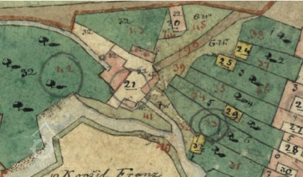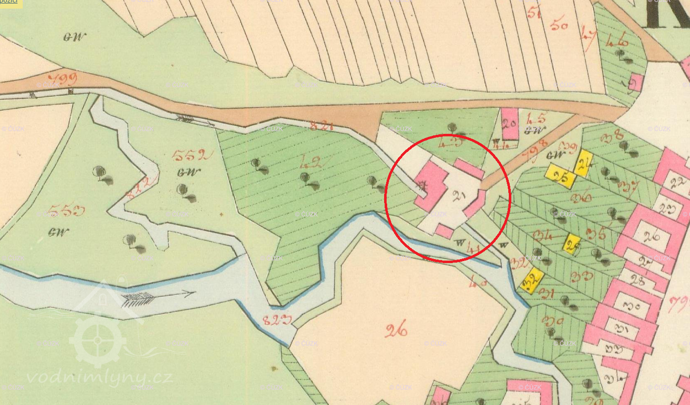 Popis1930: 1 kolo na svrchní vodu, hltnost 0,29 m3/s, spád 3,5 m, výkon 10 HP