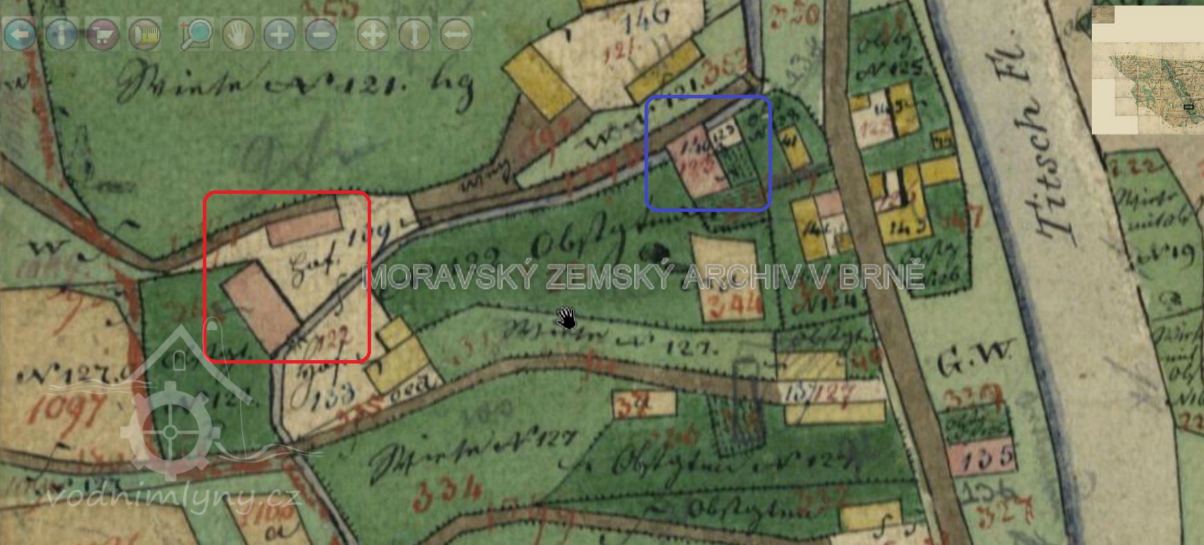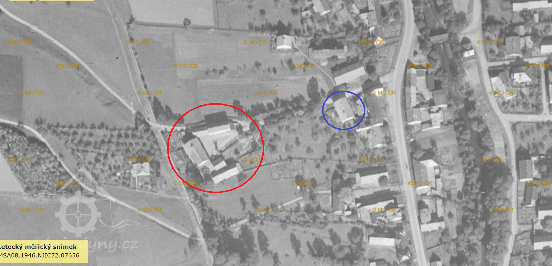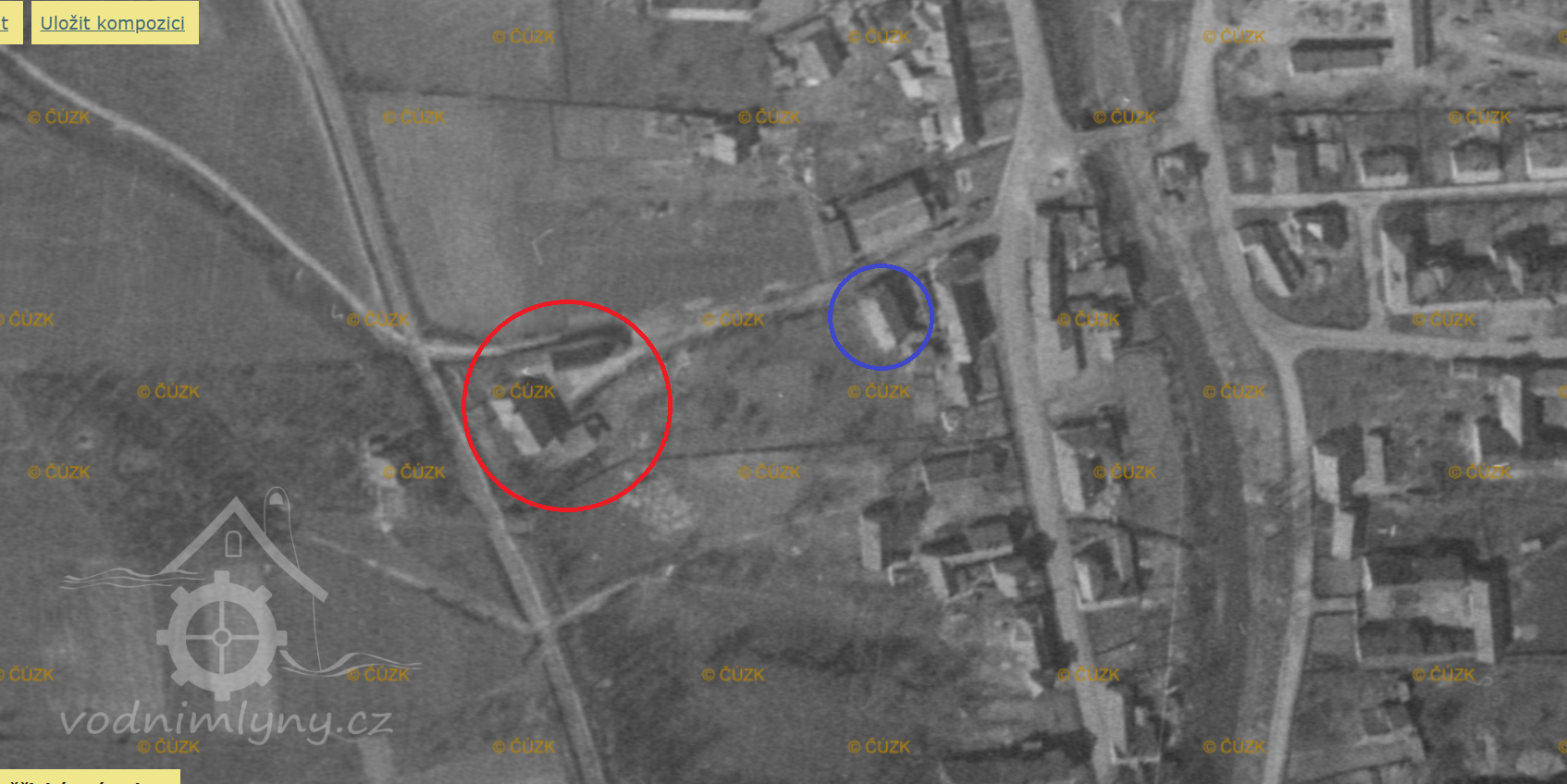 Komplex mlýna čp. 122 a níže na náhonu ležící pily čp. 123. Zatímco mlýnice již nestojí (na jejím místě se nachází plocha uhelných skladů), byla pila přestavěna na obytný domek.