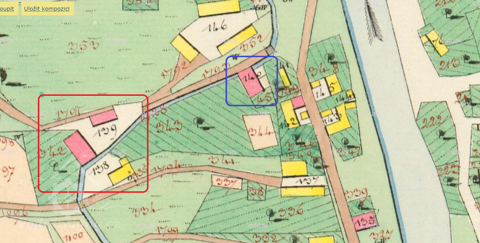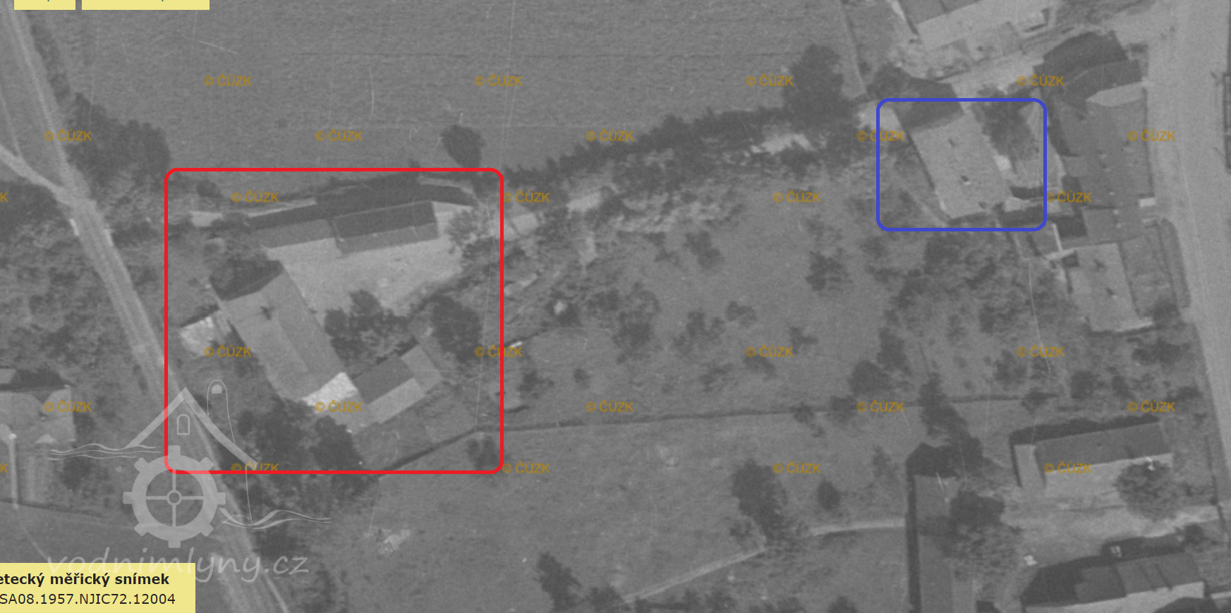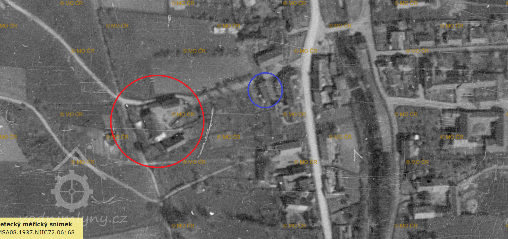 Komplex mlýna čp. 122 a níže na náhonu ležící pily čp. 123. Zatímco mlýnice již nestojí (na jejím místě se nachází plocha uhelných skladů), byla pila přestavěna na obytný domek.