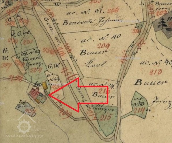 Mlýn kreslený již na 1. vojenském mapování, vzhledem k nestálosti toku byl nad ním rybník, který se (byť vypuštěný) dochoval dodnes, ve 2. a 3. vojenském mapování již není zakreslen jako mlýn, avšak v terénu dochovány zbytky zděných budov dodnes.