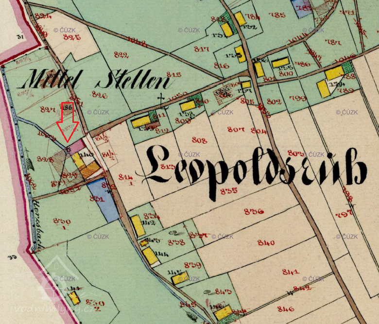 Starší ze dvou vodních mlýnů v Leopoldce založený kolem roku 1700 byl v roce 1830 přebudován na průmyslový podnik, který několikrát změnil výrobní program. Dnes slouží jako bytový dům.
