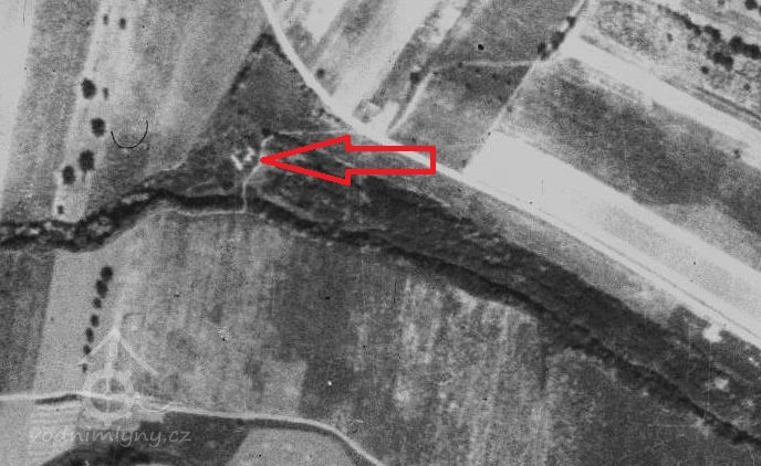 Na leteckém snímkování z roku 1946 se mlýn ještě nachází. (JV)