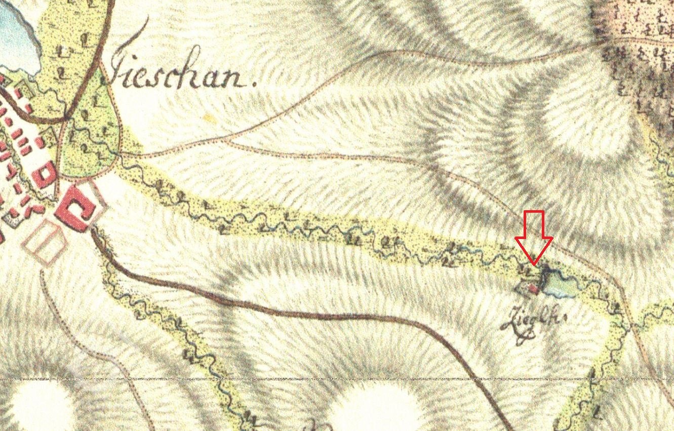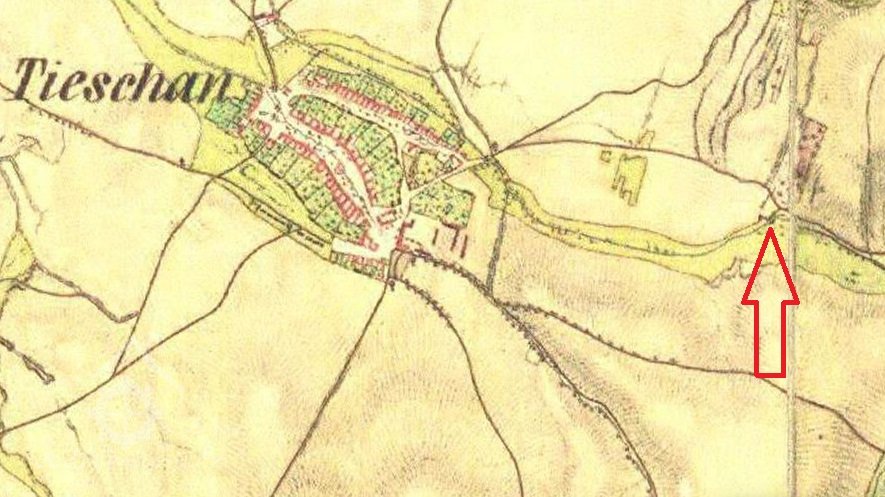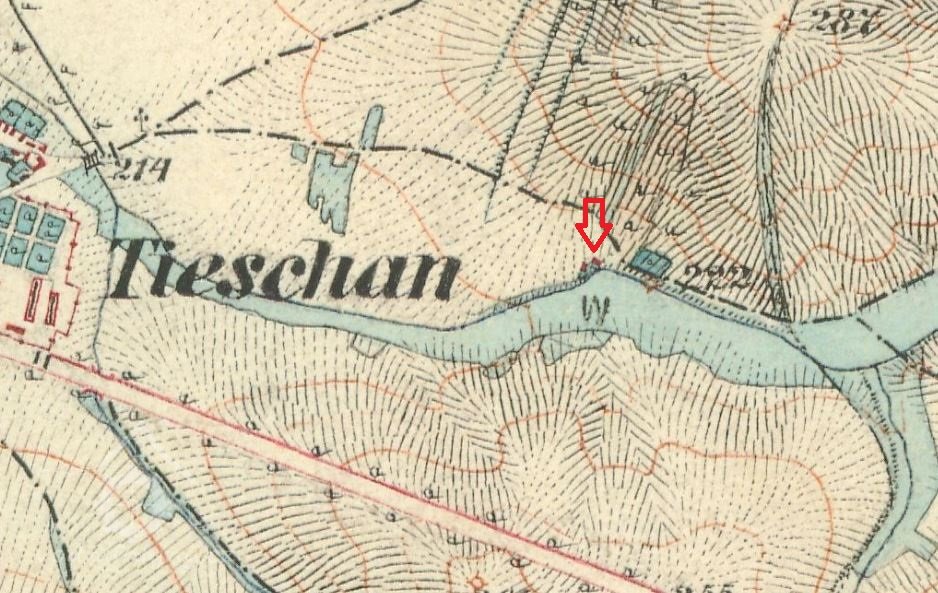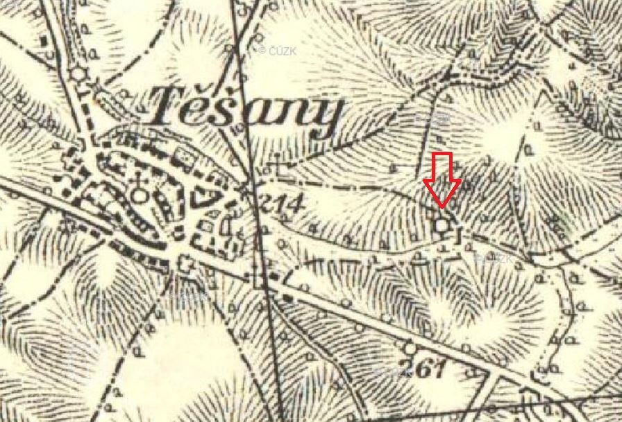 Mlýn ležel východně od obce Těšany u rybníka dnes zvaného Těšany.