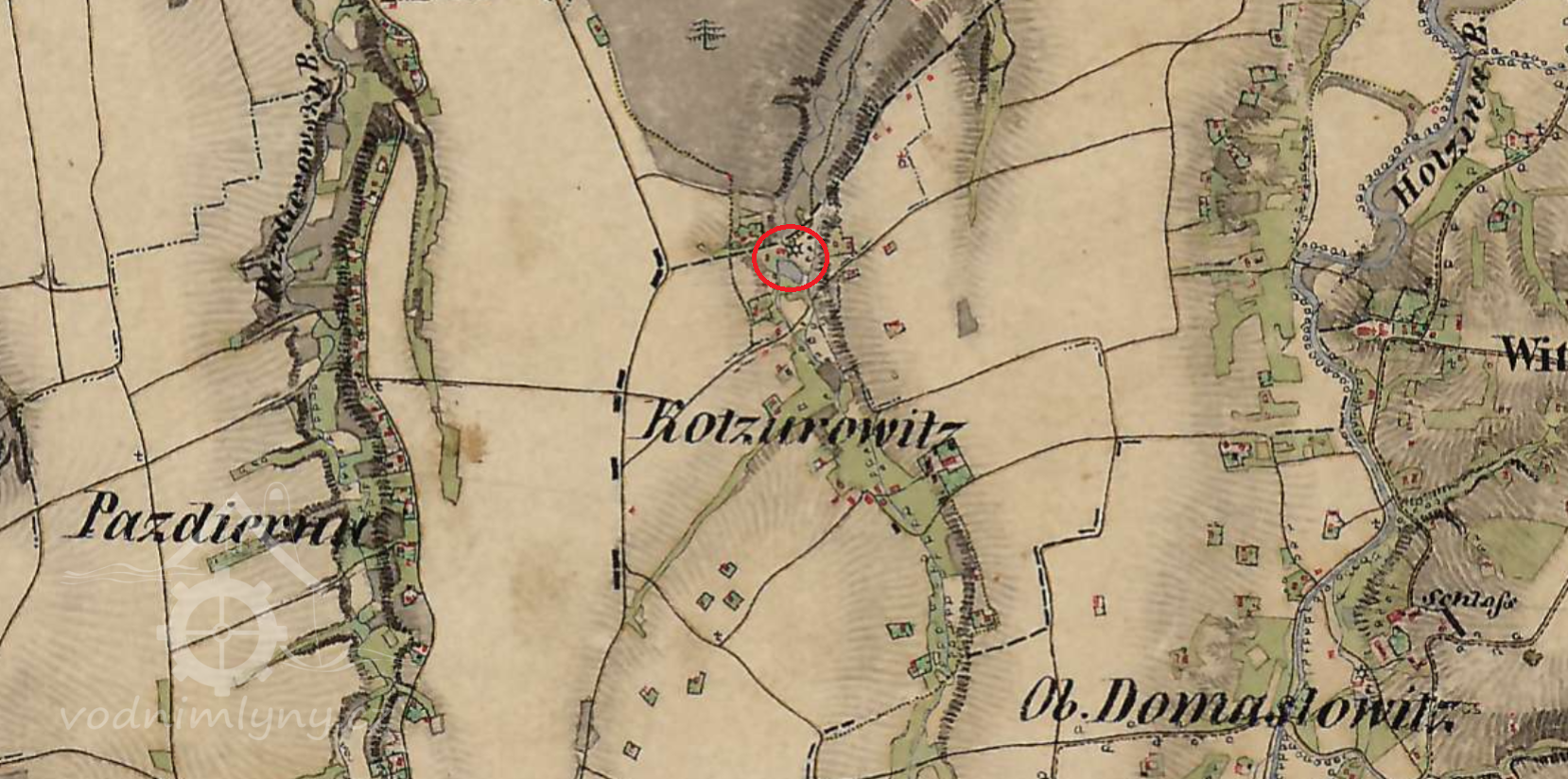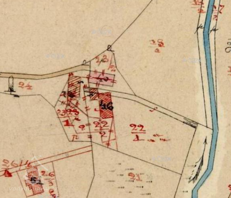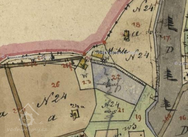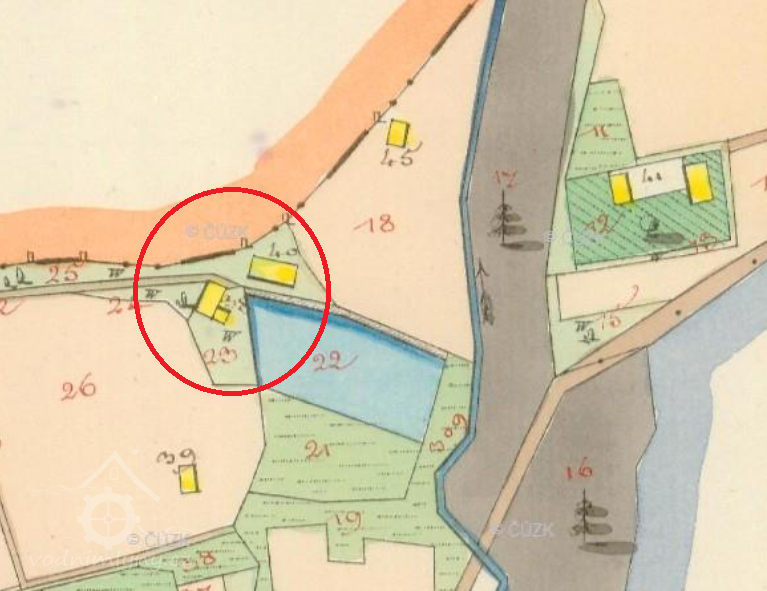 Mlýn pod hrází obdélného rybníku č. 22, do kterého byla přiváděna voda strouhou z blízkého potoka Řepníku. V rybníce se zadržovala voda potřebná pro pohon mlýnského kola. Na východním průčelí bylo umístěno mlýnské kolo k němuž byla voda z rybníka svedena v dřevěném korytě (vantrokách).