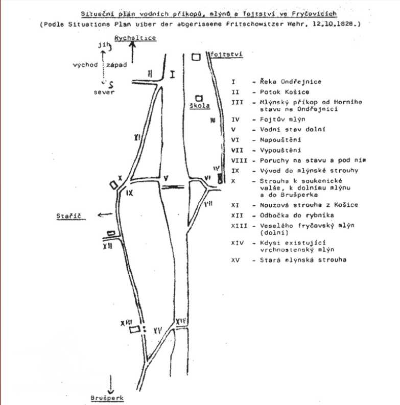 náhonu na dolní mlýn a brušperské mlýny a opravdu ochuzoval Ondřejnici o vodu potřebnou pro uvedené mlýny. Na tuto skutečnost si často vrchnosti brušperští mlynáři stěžovali. Zřejmě, aby bylo docíleno rozumného smíru, svedl v neznámé době fojt ústí náhonu za svým mlýnem pomocným kanálem o přibližně 30 m výše a do Ondřejnice jej zaústil spolu se zmíněným regulačním kanálem nad tzv. dolní stav. Částečně tak navrátil většinu využité vody z náhonu zpět do řeky ještě před začátkemdolního náhonu.