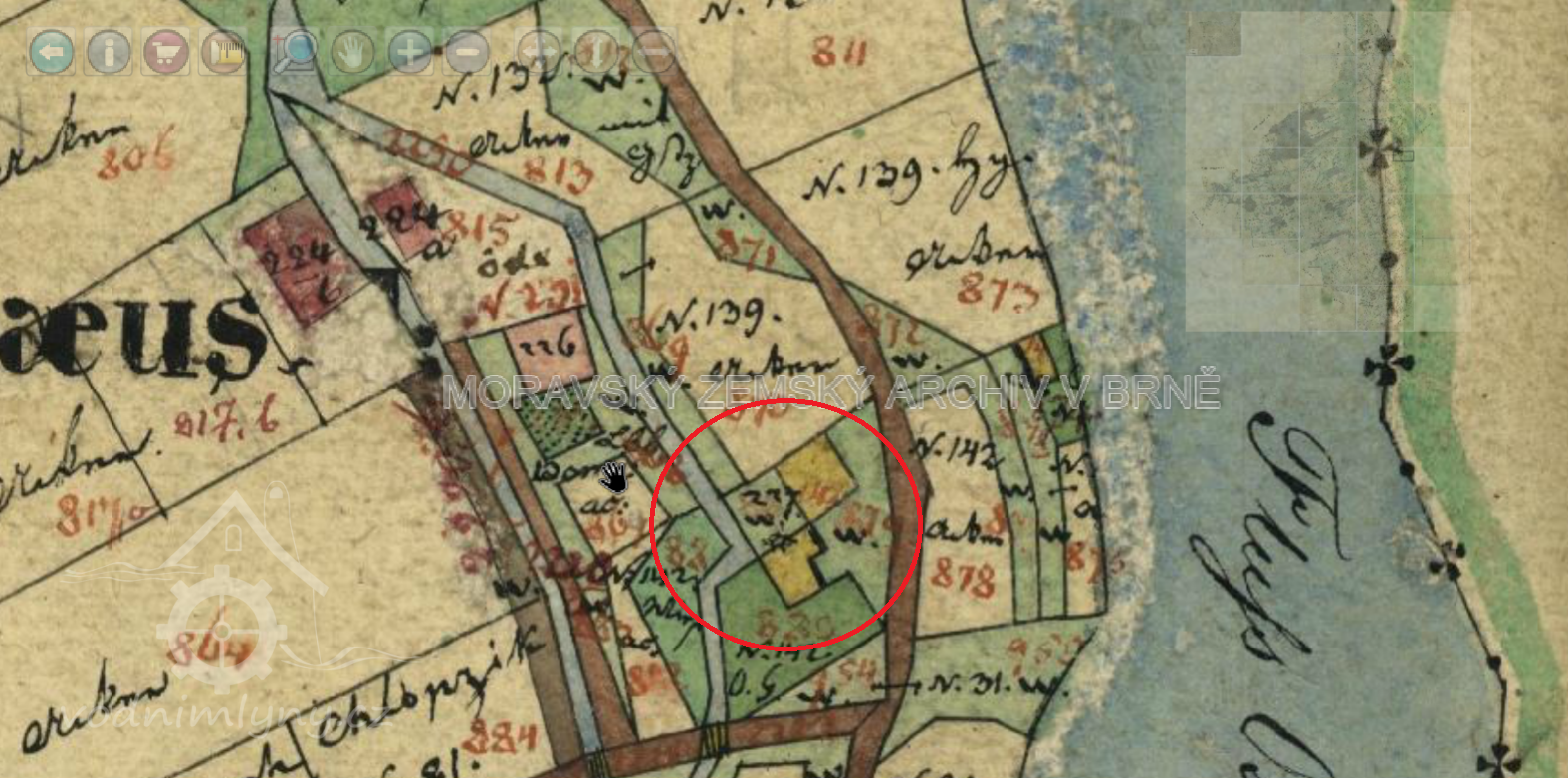 PopisMísto dřevěného kola zřízeno kolo železné na vrchní vodu k pohonu obráběcích strojů mechanické dílny